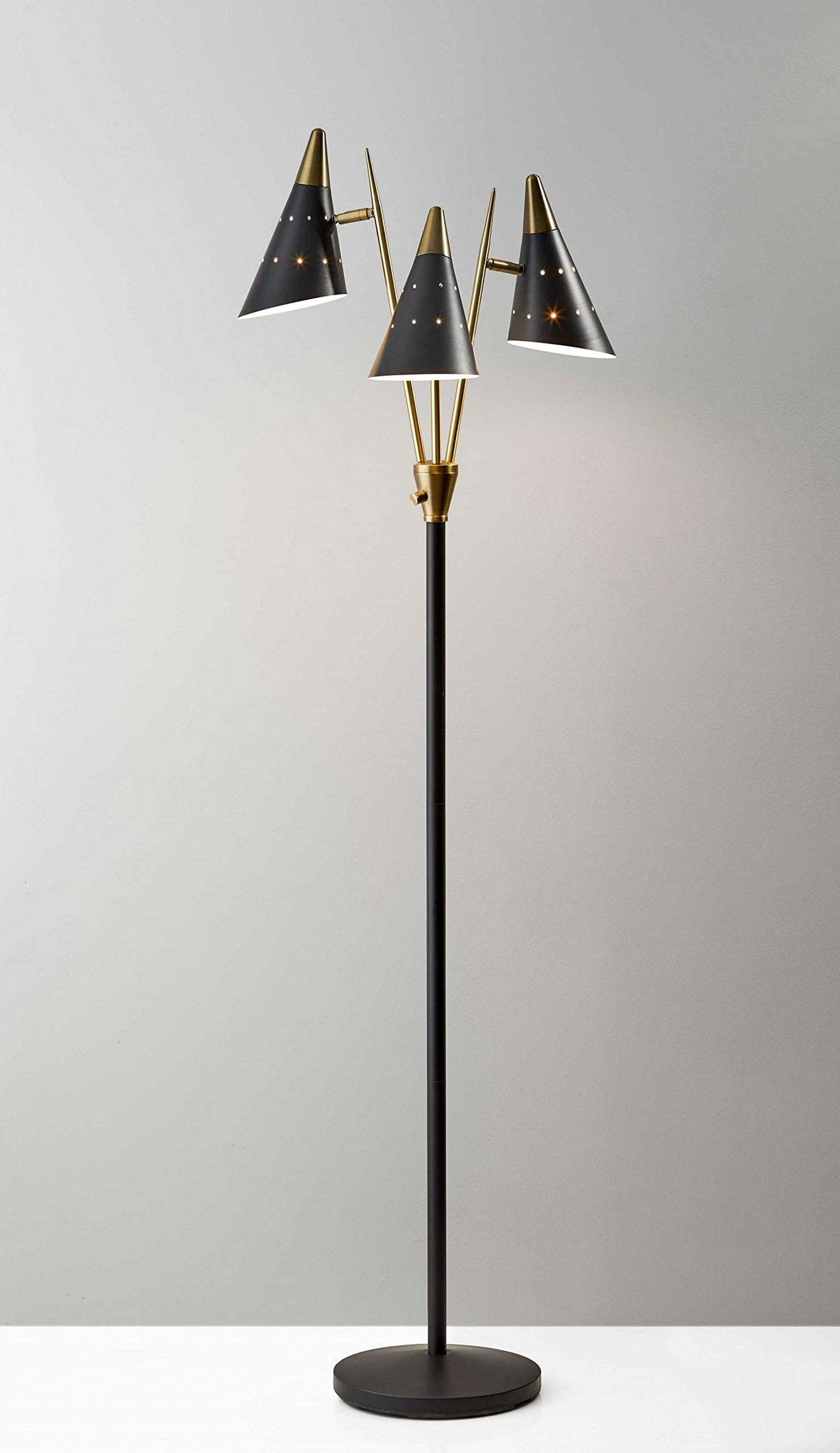 Q: What style of decor does this lamp complement?A: With its matte black finish and antique brass accents, this floor lamp complements various decor styles, including contemporary, mid-century modern, retro, and transitional spaces.