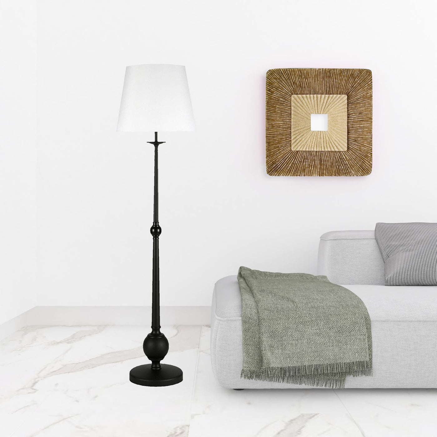 Q: What materials are used in this floor lamp?A: The lamp features a handcrafted blackened bronze metal base, paired with a white drum shade made of fabric, ensuring both style and durability.