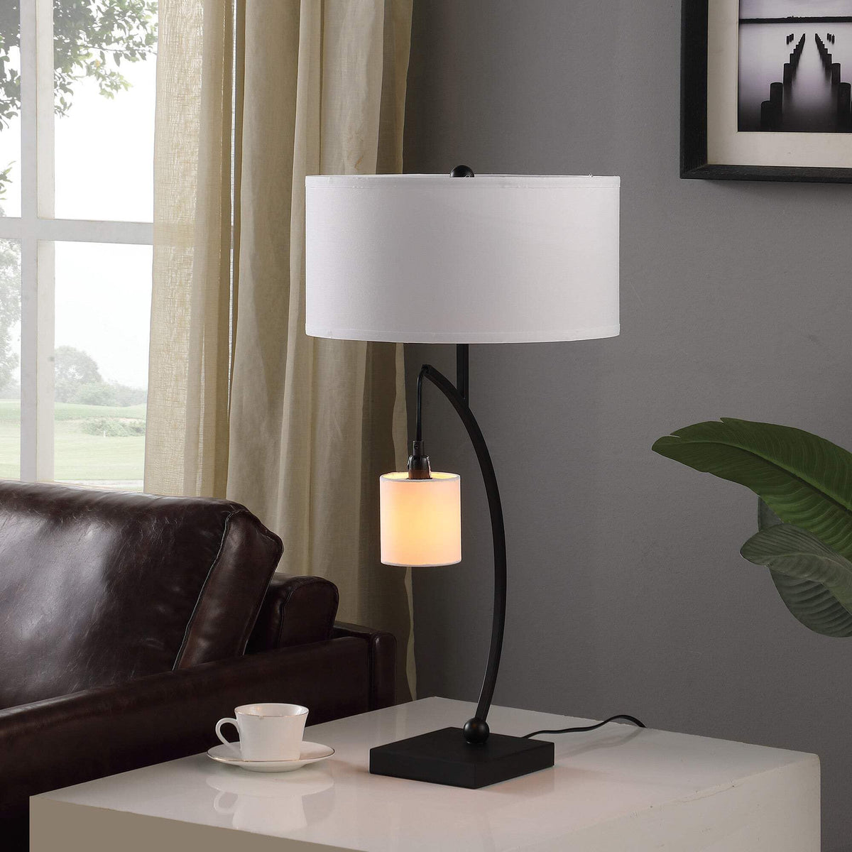The Homeroots Arched Table Lamp Features A Robust Black Metal Base, Paired With A Chic White Drum Shade, Creating A Sophisticated Look That Complements Various Décor Styles. The Lamp Includes Two Light Sources: A Larger Main Light And A Smaller Hanging Pendulum Light, Allowing For Versatile Lighting Options. The Fabric Shade Ensures A Warm And Inviting Glow, While The Rotary 3-Way Switch Provides Convenient Control Over Brightness Levels. Crafted From well-made Materials, This Lamp Is Designed To Last, Making It A Valuable Addition To Your Home.