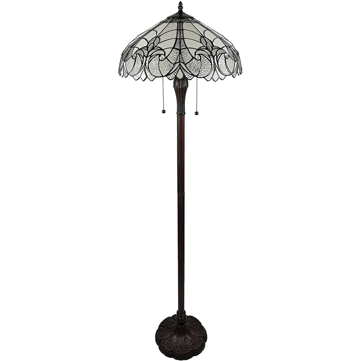 Q: What is the shade material of this floor lamp?A: The shade of the HomeRoots floor lamp is made of glass, featuring a beautiful stained glass design with a white fleur de lis pattern.
