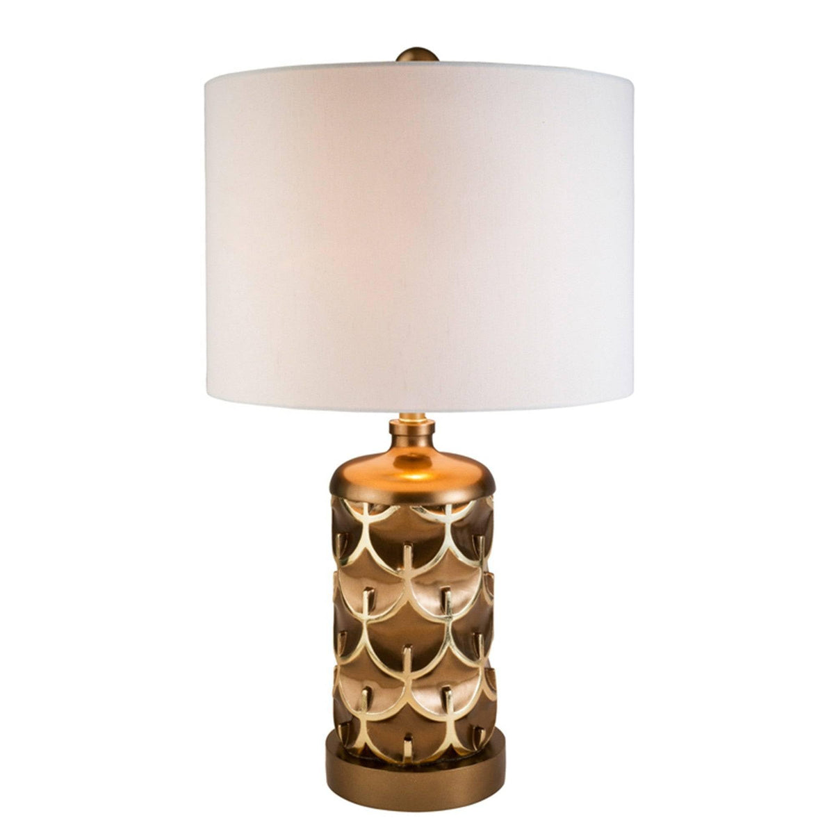 Q: What color is the lampshade?A: The lampshade of the Magestic Brown and Gold Geo Table Lamp is white.