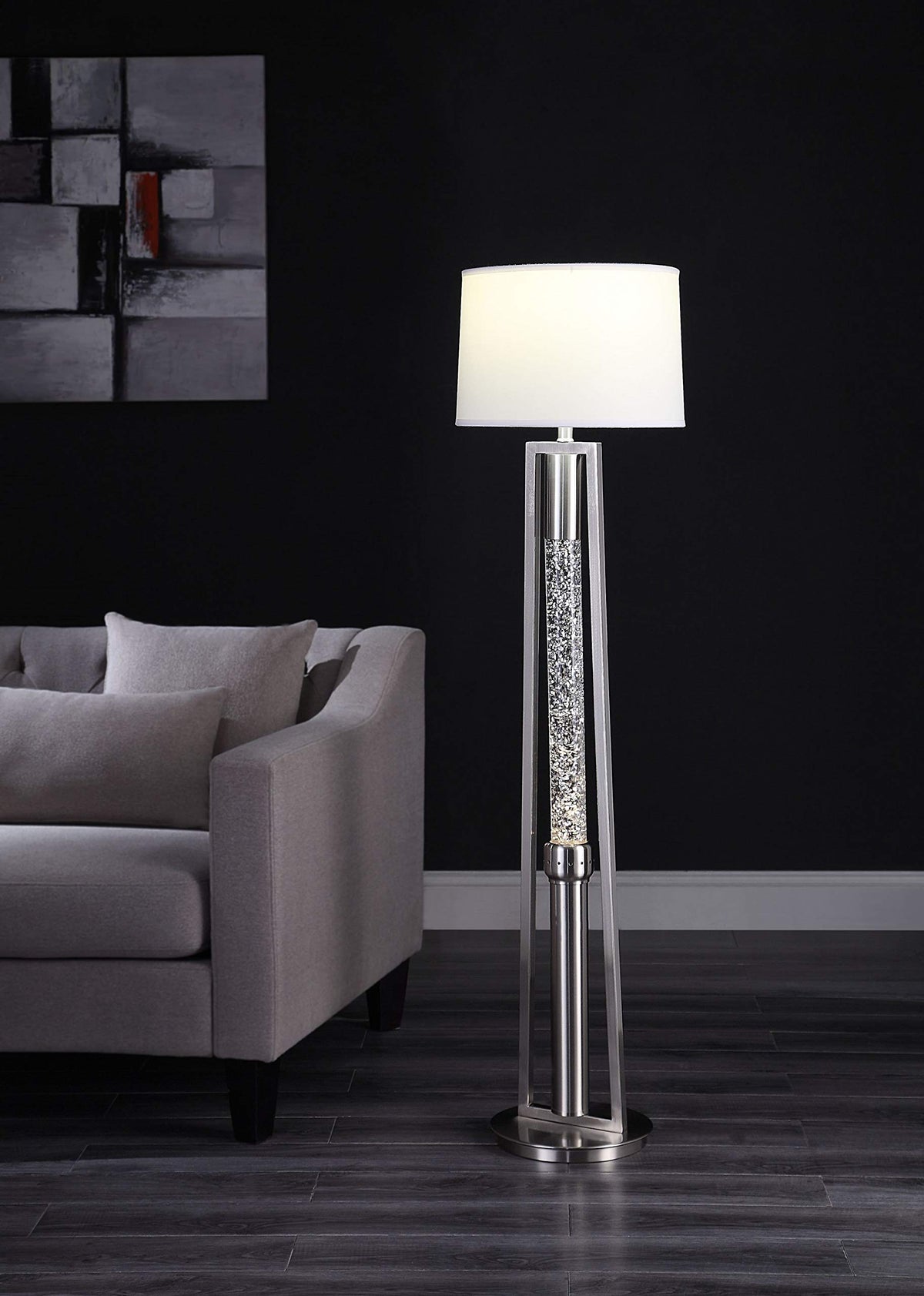 Illuminate your space in style with this lighting collection, a must-have that will add an elegant feel to any room. Featuring a brushed nickel metal base, the construction is sturdy yet stylish. Within the glass tube, there are sequins and water; and the sequins will be flowing once the light is turned on. Unique, beautiful and chic, this lighting collection will add an artful touch and be the centerpiece in any room.