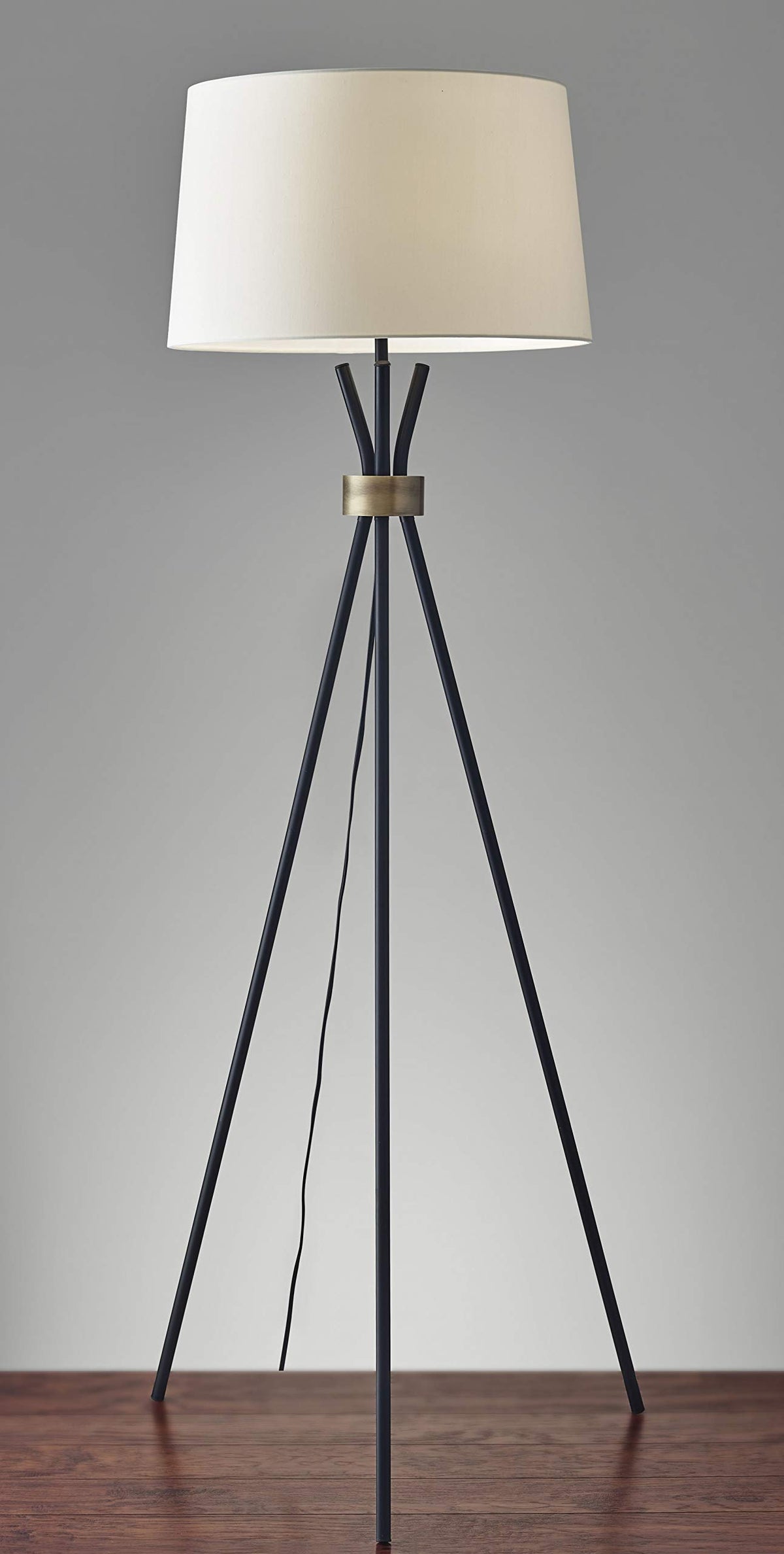 A stunning silhouette with midcentury elements this floor lamp is a tripod of black metal legs gathered at the neck with an antique brass accent It is topped with a modified drum shade in contrasting offwhite linen A black fabric cord completes the modern statement A threeway rotary switch is located under the socket The 3way rotary socket switch will only work with a 3way light bulb otherwise this lamp will function with a simple onoff switch at its highest setting This lamp is smart outlet compatible Bulb is not included Features. Offwhite linen fabric shade. Durable construction for lasting use. Made with the finest material. 3way rotary switch. Black fabric covered cordSpecifications. Color Black Antique Brass. Material Metal