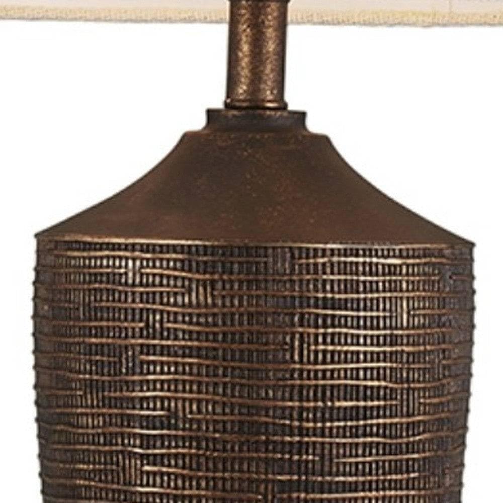 This table lamp features a unique rustic ribbed texture with a bronzed finish, creating a sophisticated and timeless appeal. Made from well-made polyresin, the lamp is both durable and easy to maintain, requiring only a damp cloth for cleaning. The fabric lampshade, crafted from 100% linen, softens the light for a cozy atmosphere while adding a touch of elegance to your decor. The lamp is equipped with a convenient 3-way rotary switch located on the bulb socket, allowing for easy control of the lighting intensity.