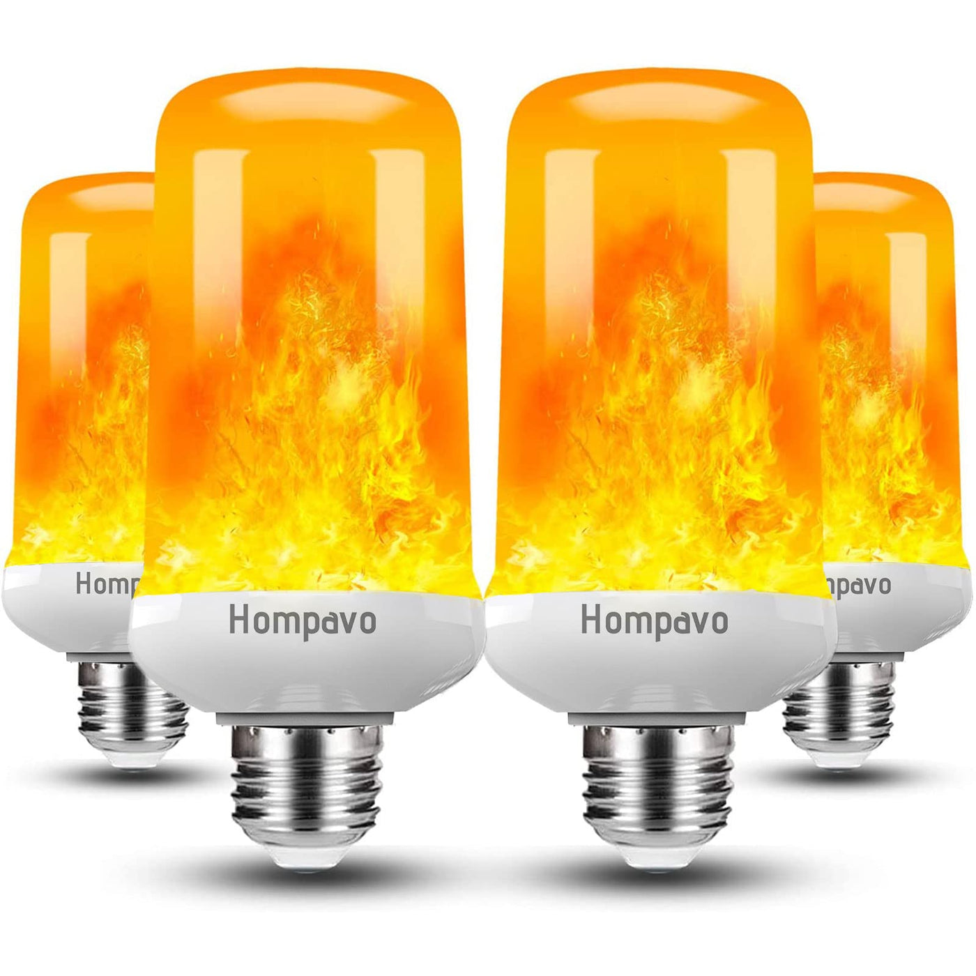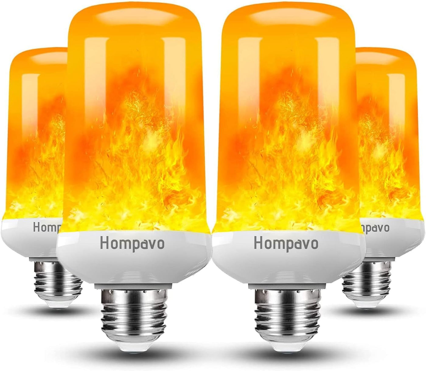 Q: What are the different lighting modes available for the Hompavo LED Flame Light Bulbs?A: The Hompavo LED Flame Light Bulbs feature four different lighting modes: flickering flame mode, breathing mode, general light mode, and an upside-down mode that automatically switches the flame direction, allowing you to create the perfect ambiance for any occasion.