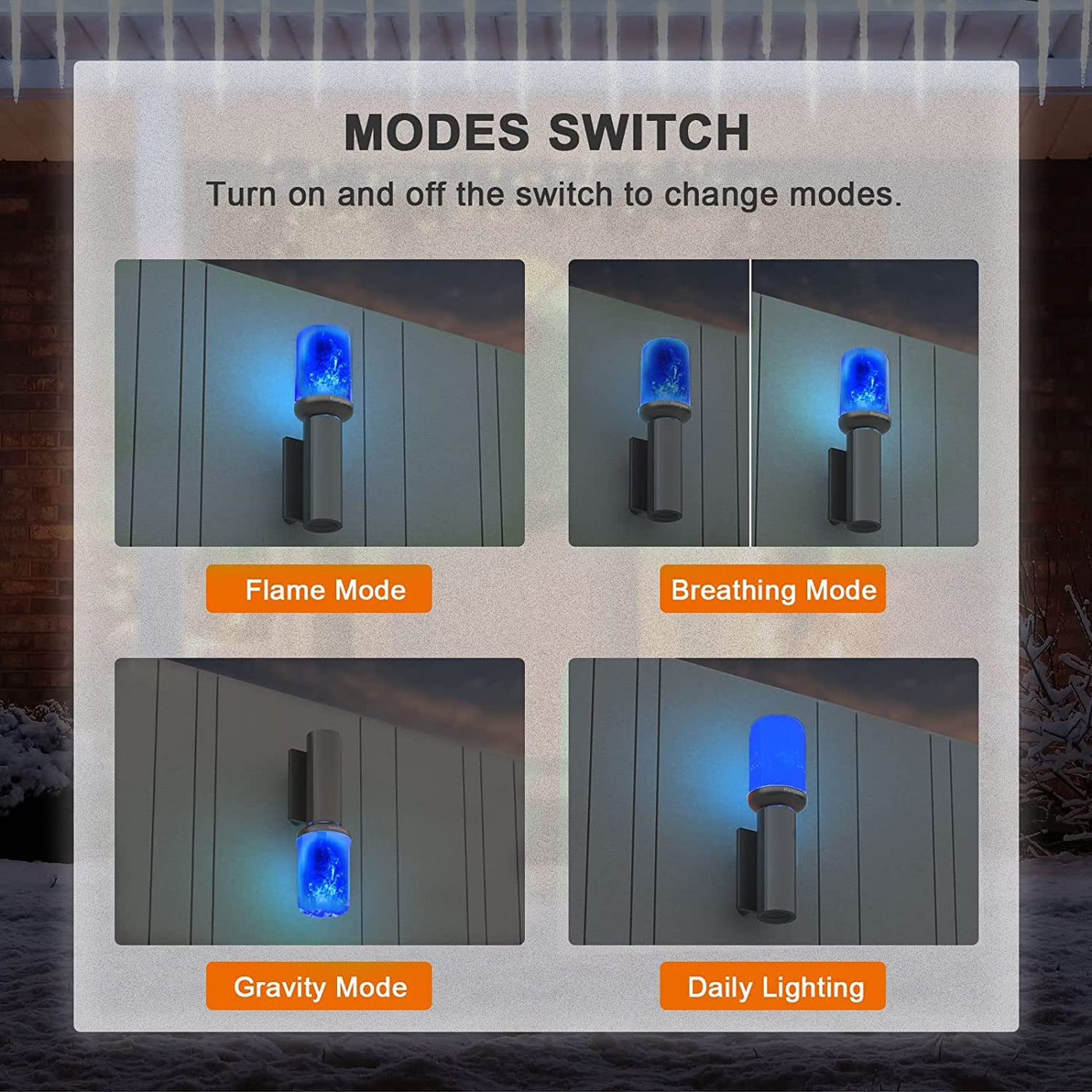 - **Multiple Lighting Modes**: Choose from four unique lighting modes—flickering flame, breathing, general light, and an upside-down mode. Easily switch between effects with a simple on-off operation.