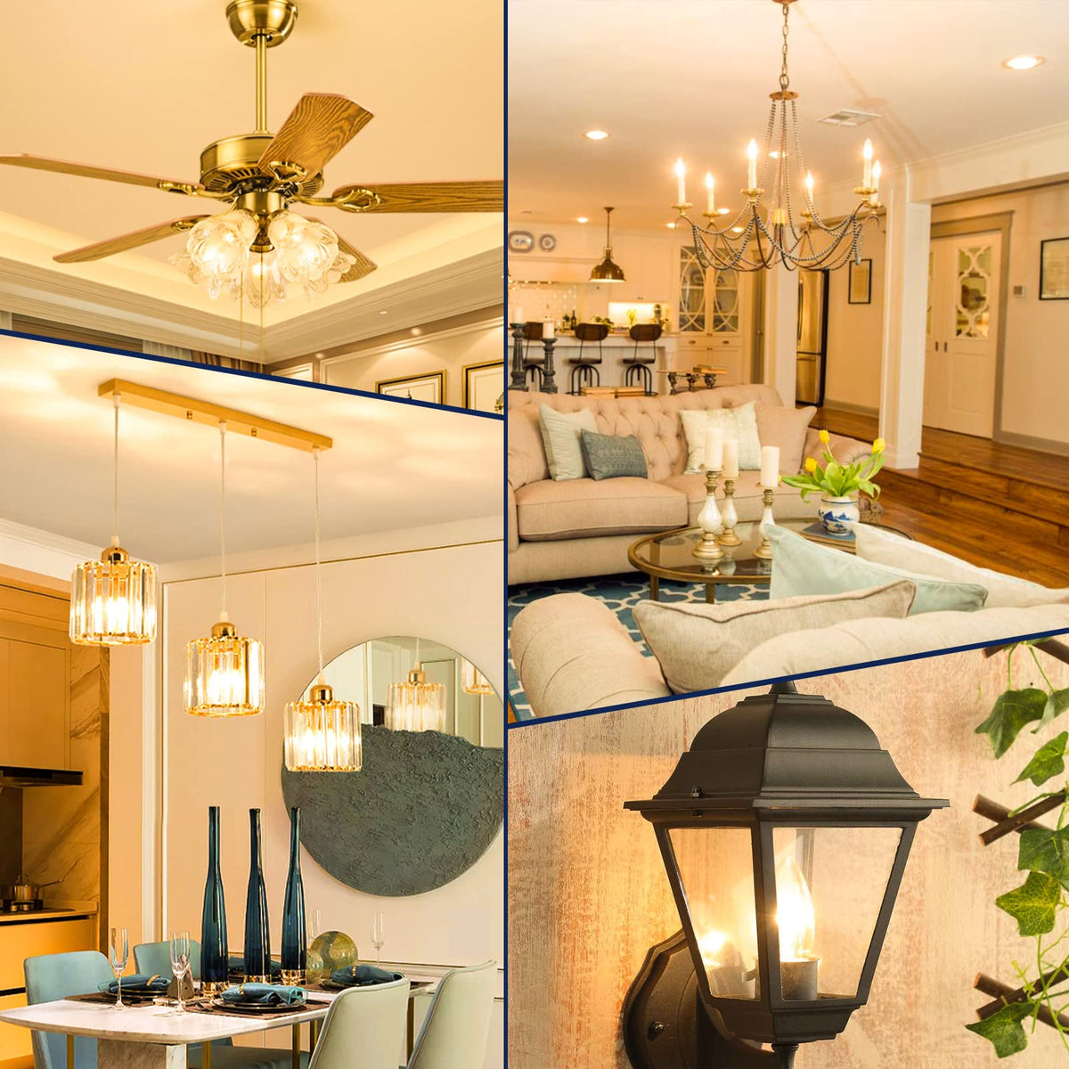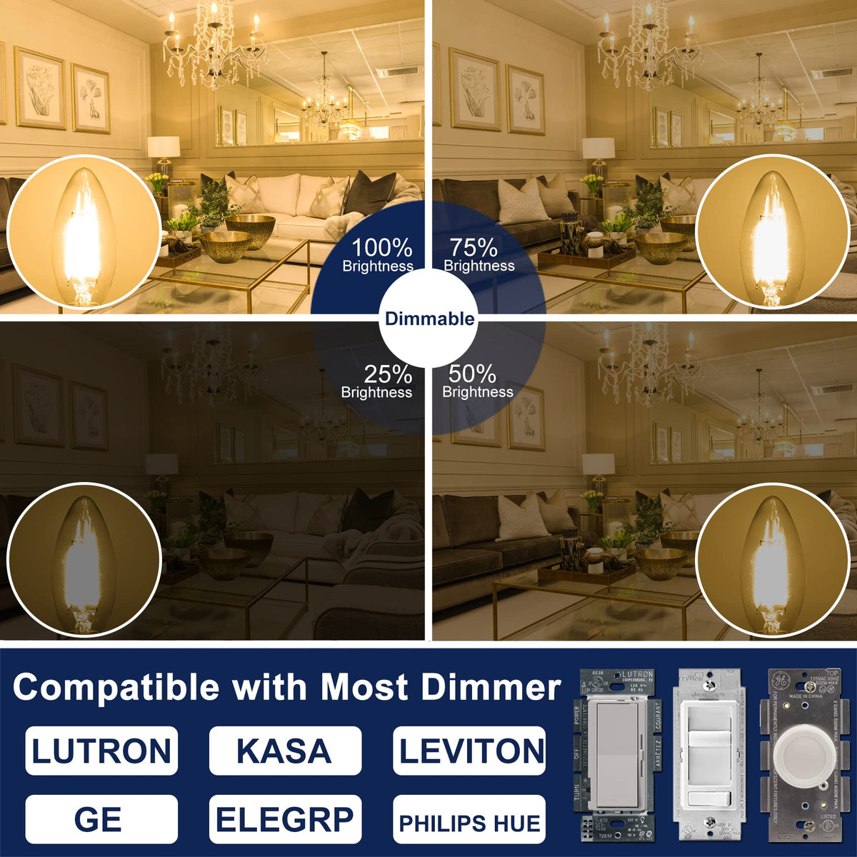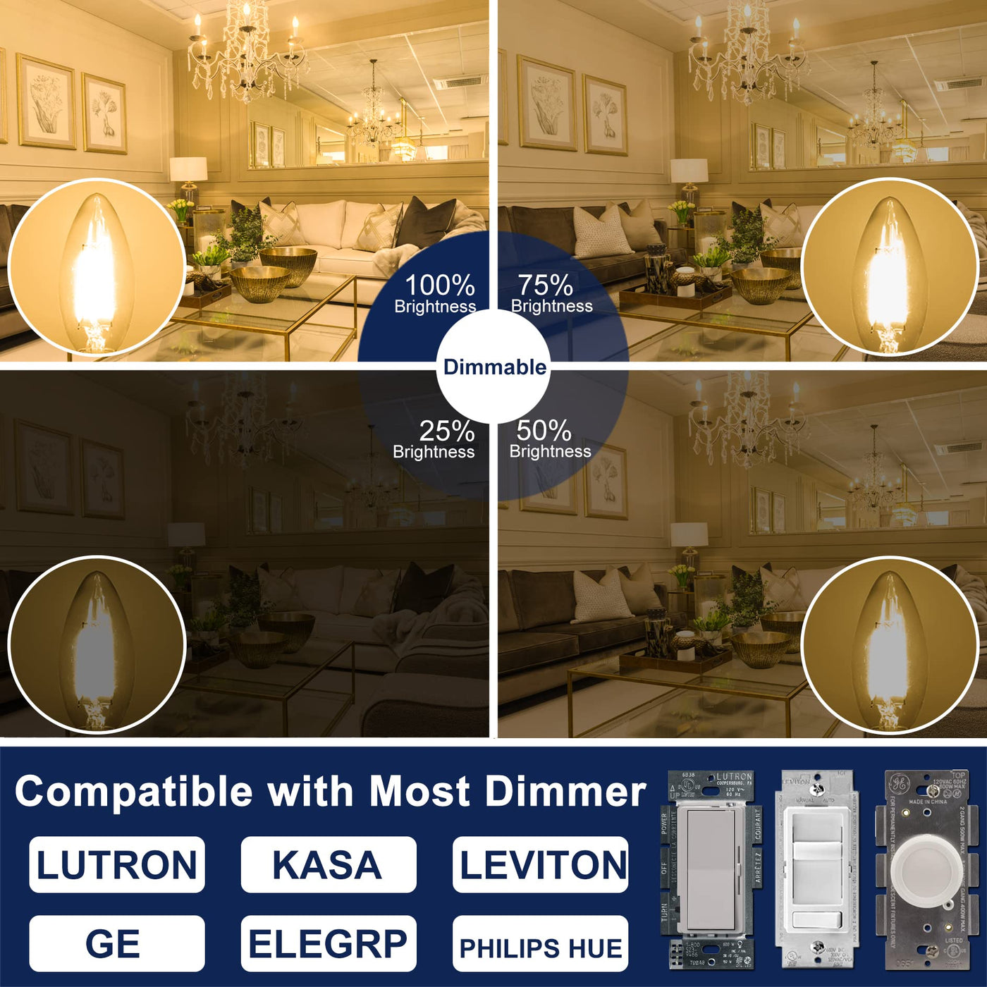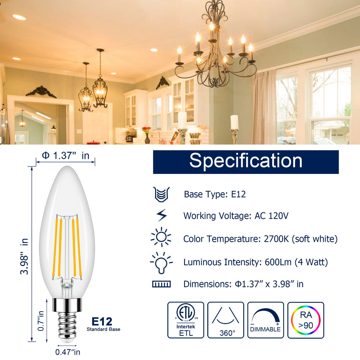 Please Note: Most traditional incandescent or CFL bulbs dimmers could not be used for LED bulbs, which may cause LED bulbs flicker or not-working, please upgrade your dimmer to support LED bulbs. FEATURE -All Honesorn LED light bulbs are meet strict test criteria. Zero harsh glares prevents eye fatigue. -10%-100% smooth dimming without flickering or humming. Compatible with most of modern LED dimmers in US -4W 2700K soft white E12 led bulb is great replacement of 60 watts incandescent light bulb. Create bright and energetic atmosphere -Professional & Fast After-Sale Service, E12 candelabra light bulb comes with 30 Day Money Back and 24 Months after-sale service. -Made of high transparent glass, 360 degrees beam angle, less heat and instant on. - Edison style candle shape with vintage filament perfect choice for decorative lighting, good for candelabra led bulbs, led chandelier light bulbs, ceiling fan bulbs, candle light bulbs, 60 watt candelabra bulbs, light bulbs 60 watt, etc SPECIFICATION -Dimmable -Base Type: E12 -Wattage: 4 Watts -Voltage: 120V AC -Material: Clear Glass -Beam Angle: 360 Degree -Type: B11/C35 -Luminous Intensity: 600lm -Size: 1.37x1.37x3.98 inches -Bulb Shape: C35 Candle Bulb -Color Temp: 2700K Soft White -Incandescent Equivalent: 60W RECOMMENDED DIMMERS -Lutr*n Brand: DVCL-153P, DVELV-300P, MA-600, MACL-153M, TGCL-153P, S-600P -Leviton Brand: 6674-P0W, 6672-1LW, IPL06-10Z, TSL06-1LW, DSL06-1LZ ATTENTION -Kindly remind you to switch off the power before installation. -Lighting recommends using a Leviton or Lutr*n dimmer for optimal results. -Please keep the light bulbs away from direct sunshine and rainwater.