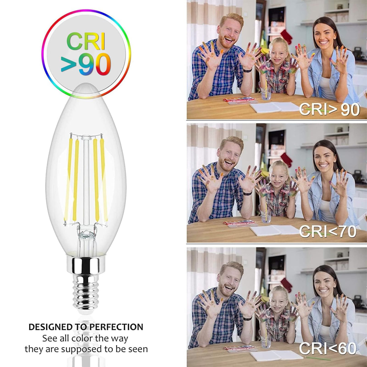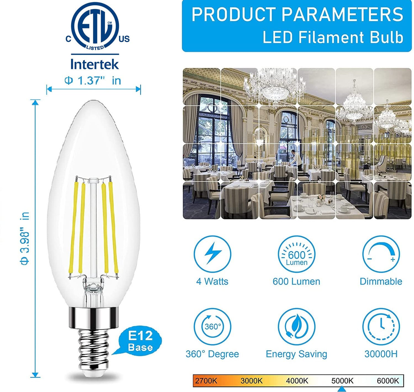 Constructed from well-made clear glass, this bulb features a classic Edison-style candle shape that adds a decorative touch to any fixture. The dimmable functionality allows users to adjust brightness from 10% to 100% smoothly, making it compatible with most modern LED dimmers in the US. The 360-degree beam angle ensures even light distribution, reducing harsh glares and preventing eye fatigue. With an equivalent output of 60 watts incandescent light, this energy-efficient bulb delivers a luminous intensity of 600 lumens while consuming only 4 watts of power.