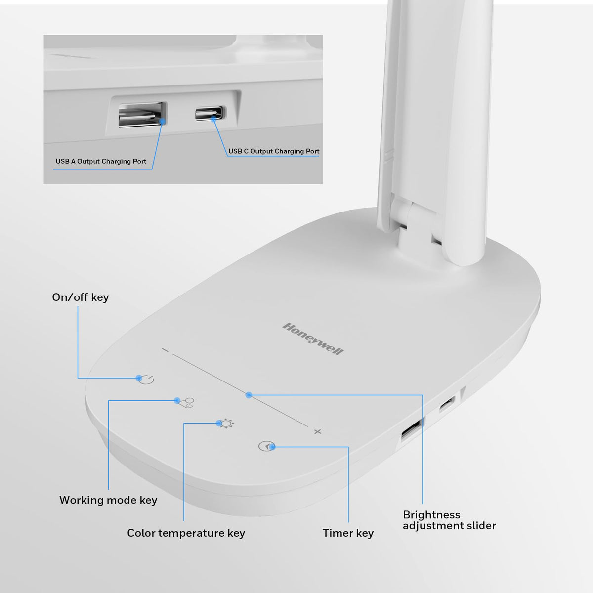 Q: Can I charge my devices using the Honeywell LED Desk Lamp?A: Yes, the Honeywell HWT-H2 is equipped with dual USB charging ports (USB A and C) at the base, providing 5V/2A output. This feature allows you to charge multiple devices such as smartphones, tablets, and speakers simultaneously, making it a practical addition to your workspace.