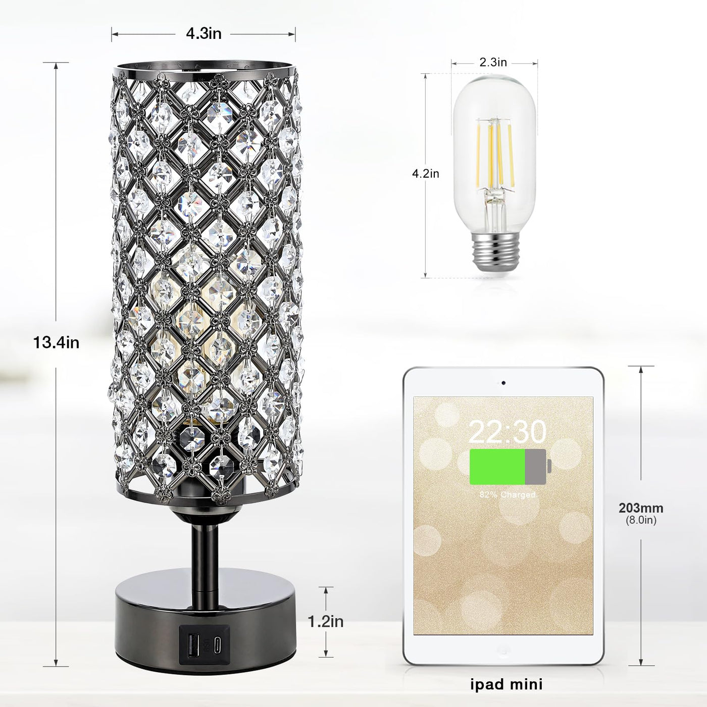 Black Crystal Table Lamp With Usb C+A Ports Touch Feature To Turn On And Off The Lights,Girls Table Lamp Makes Desk Lamp Easy To Use. Crystal Design Makes Table Lamp Look Sparkling, Adding A Romantic Atmosphere To Your Room.Different Novel Ideas Come Together In A Very Stylish Design To Form This Fantastic Product! Very Handy Designbedside Touch Lamp With Lightweight But Modern Elegant Design, Crystal Table Lamp Doesn'T Take Up Much Space, But Provides Great Lighting And Has Usb C+A Ports For Convenient Device Charging. 3 Way Dimmable Touch Lampblack Lamp Has A 3-Way Dimmer That Goes From Bright To A Soft Glow With The Tough Of My Finger. The Lowest On The Dimmer Is Perfect Soft Light For Relaxing In The Bathtub. Especially During The Middle Of The Night When I Need Lighting. I Dont Have To Search For The Switch To Turn It On.?Specifications??Voltage: 120V?Base Type: E26,T45 (Bulb Included)?Max Power: 60W?Bulb Included: Yes?Switch: Touch Control?Body Material: Metal Base /Crystal Lamp Shade?Dimension: 13.4H) X 4.3D) X 4.3W)?Power Source: Corded-Electric?Item Weight: 1.65 Lb?Color: Blackideal Gifts For Christmas, Birthday, Anniversarythe Black Crystal Table Lamp Will Be A Nice Home Decorations Or Gift For Thanksgiving, New Year, Weddings, Parties Or Other Special Events. It Will Fit And Elevate The Aesthetics Of Any Environment. The Crystal Bedside Lamp Displays A Luxurious And Beautiful Warmth Atmosphere To A Room. It Brings A Bright And Shiny Touch To Your Beautiful House, Making Your House Much More Welcoming And Fancy!The Usb C+A Charging Ports Design Giving This Beautiful Gold Table Lamp With Both Artistic Value And Practical Value. Just Like Our Other Desk Lamps With Usb C+A Charging Ports, This Convenient Design Will Surprise And Delight People Who Receive This Gift.Please Make Sure The Usb Is Dry When Use.
