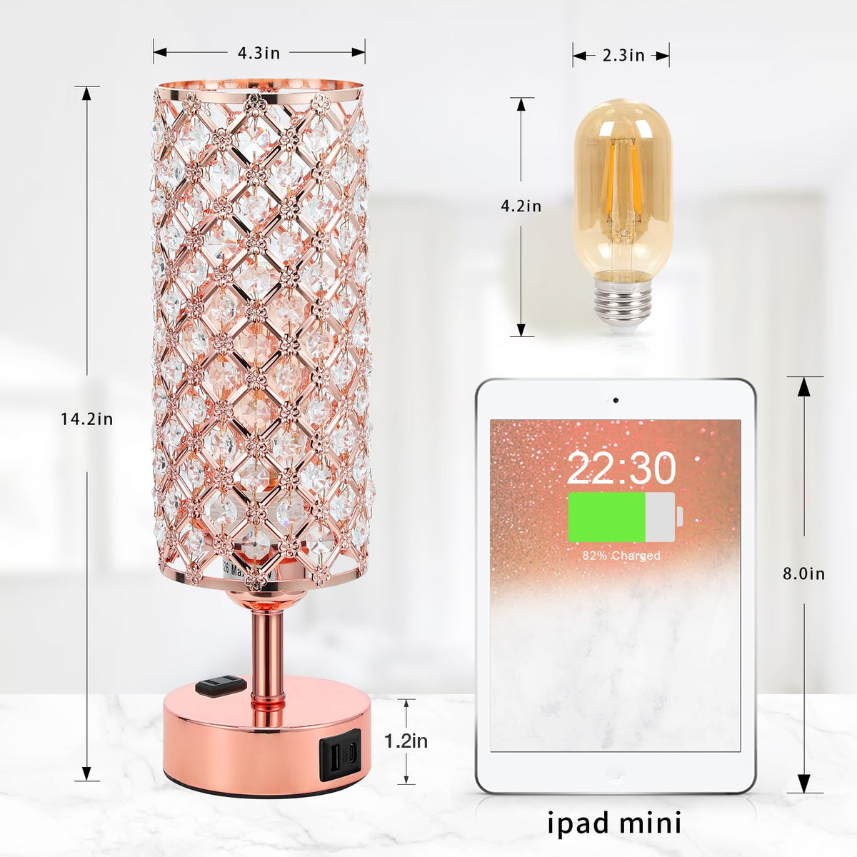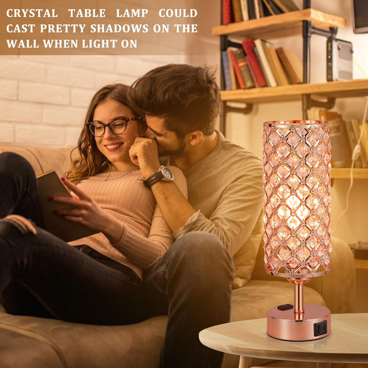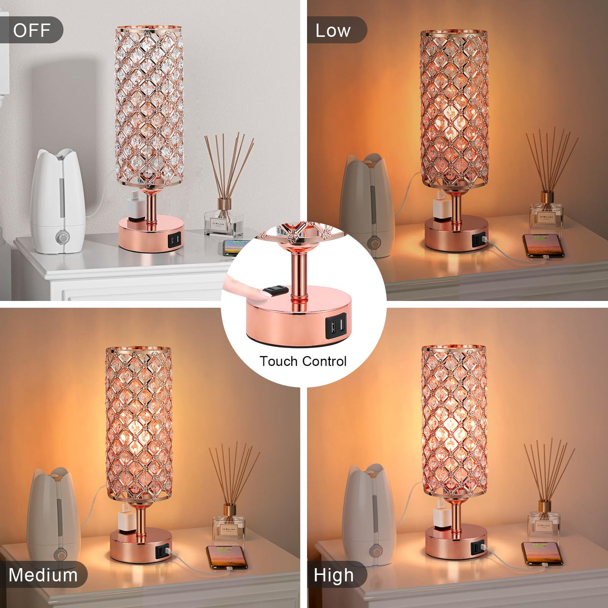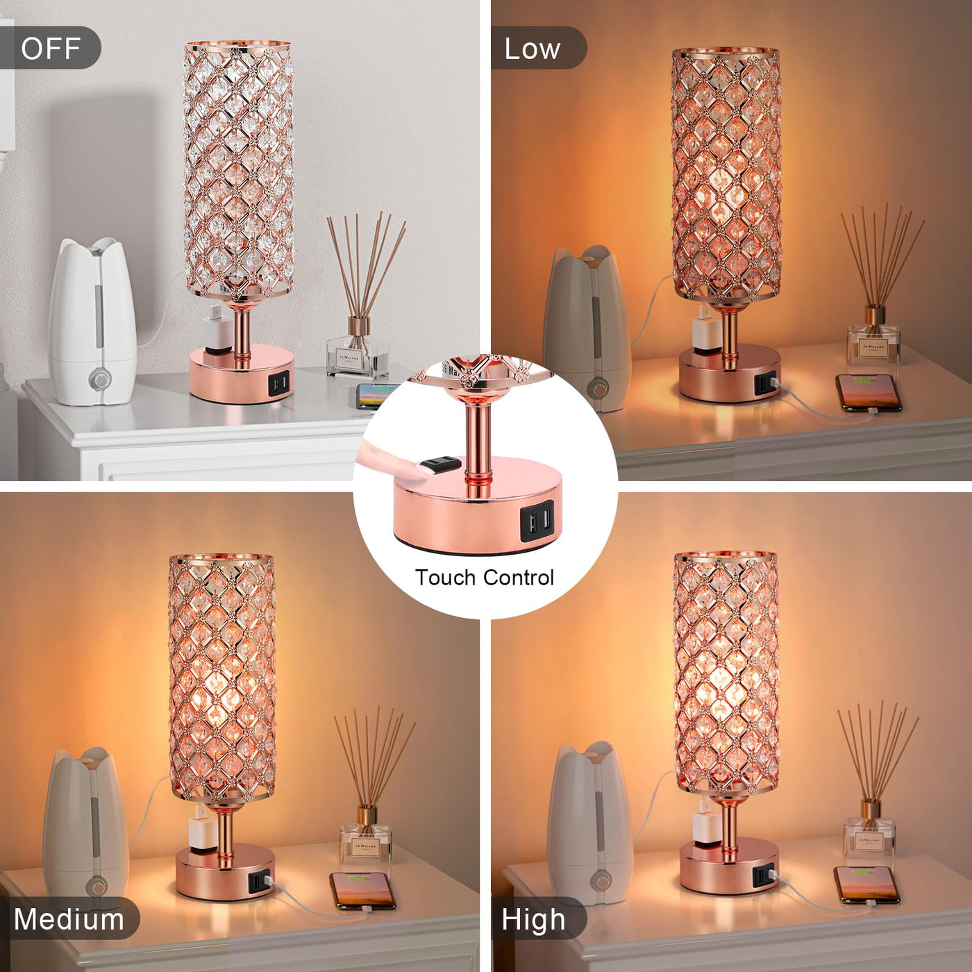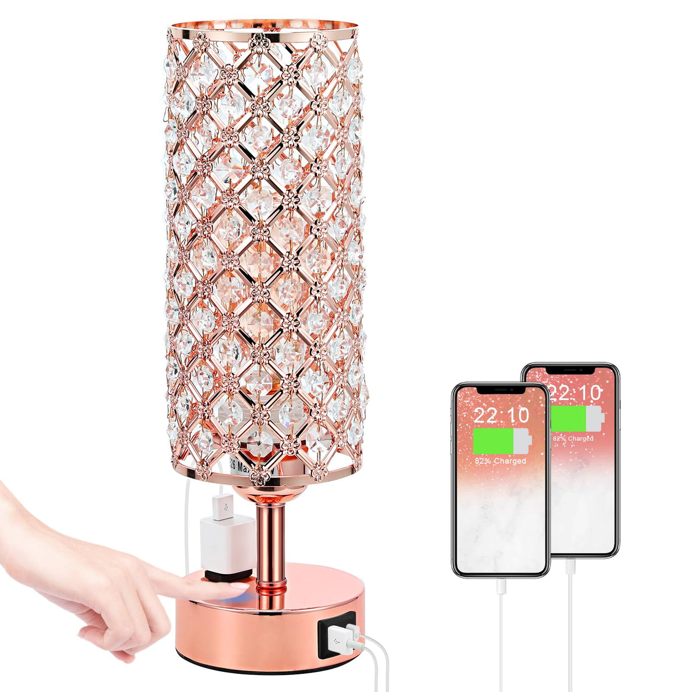 Hong-In Crystal Table Lamp, Rose Gold Bedroom Lamp With Usb C+A Ports & Ac Outlet, 3 Way Dimmable Light With Crystal Lampshade,