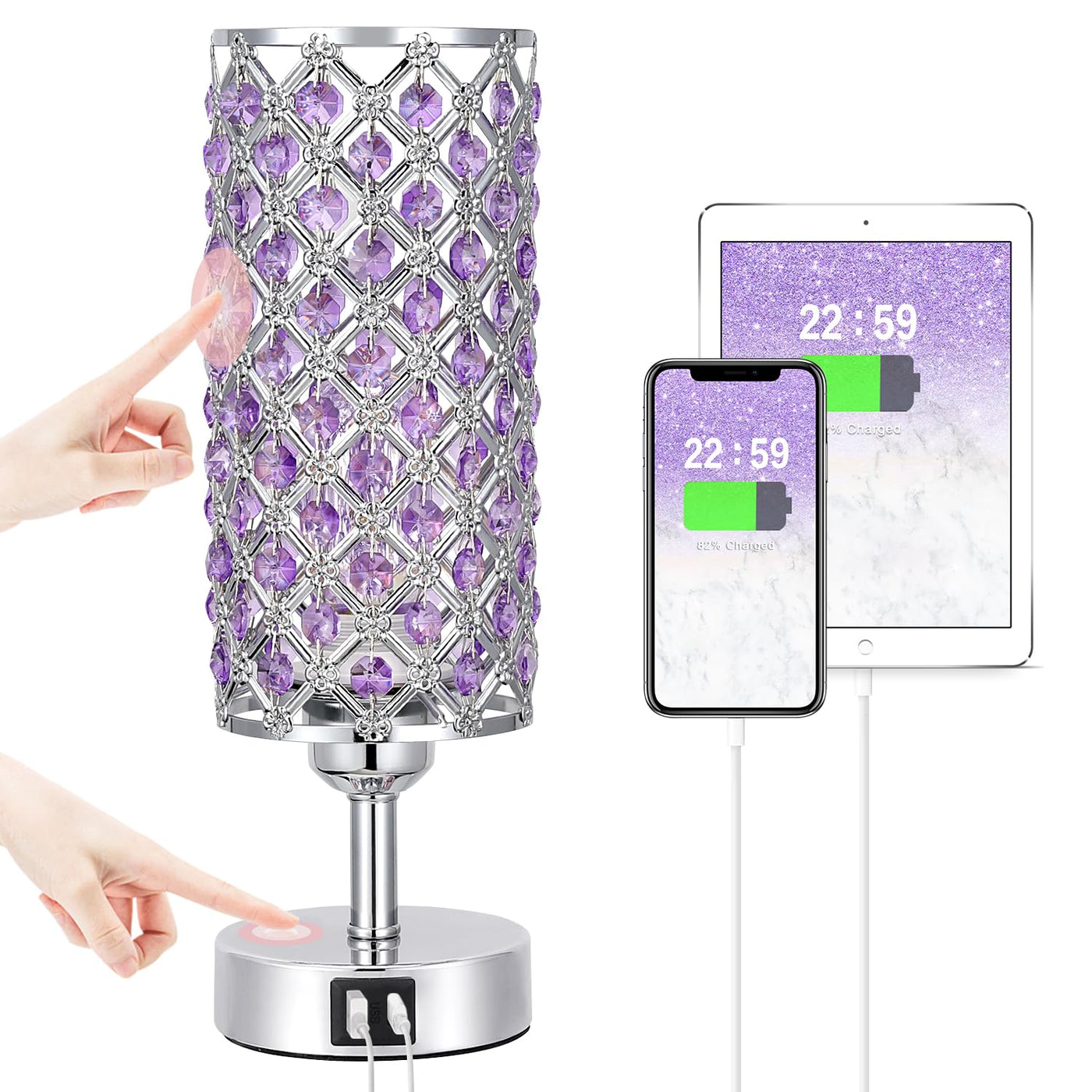 Hong-In Purple Lamp For Girls Room-Crystal Touch Lamp With Usb-C+A Ports,3 Way Dimmable Bedside Light With Crystal Shade For Bed