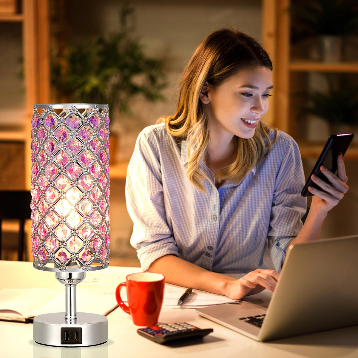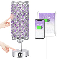 Purple Lamp for Girls Room-Crystal Touch Lamp with USB-C+A Ports,3 Way Dimmable Bedside Lamp with Crystal Shade, Accent Lamp for Bedroom Home Office