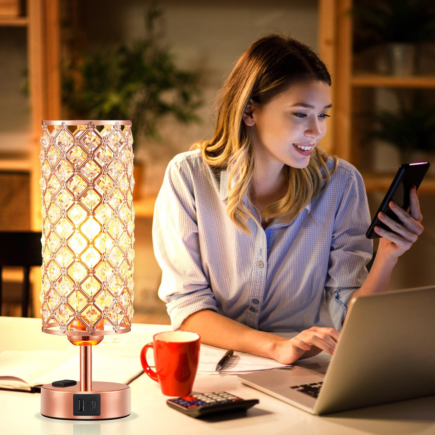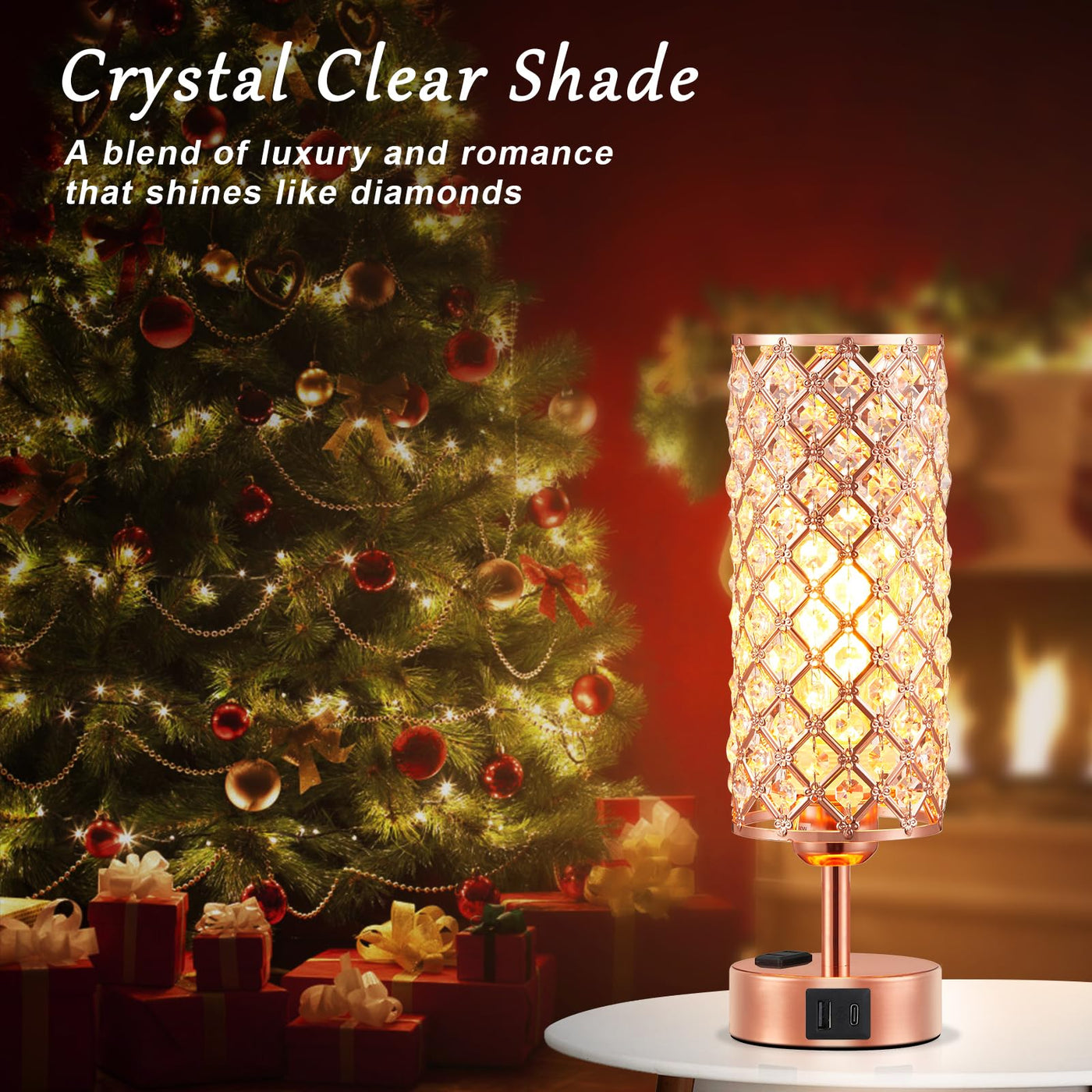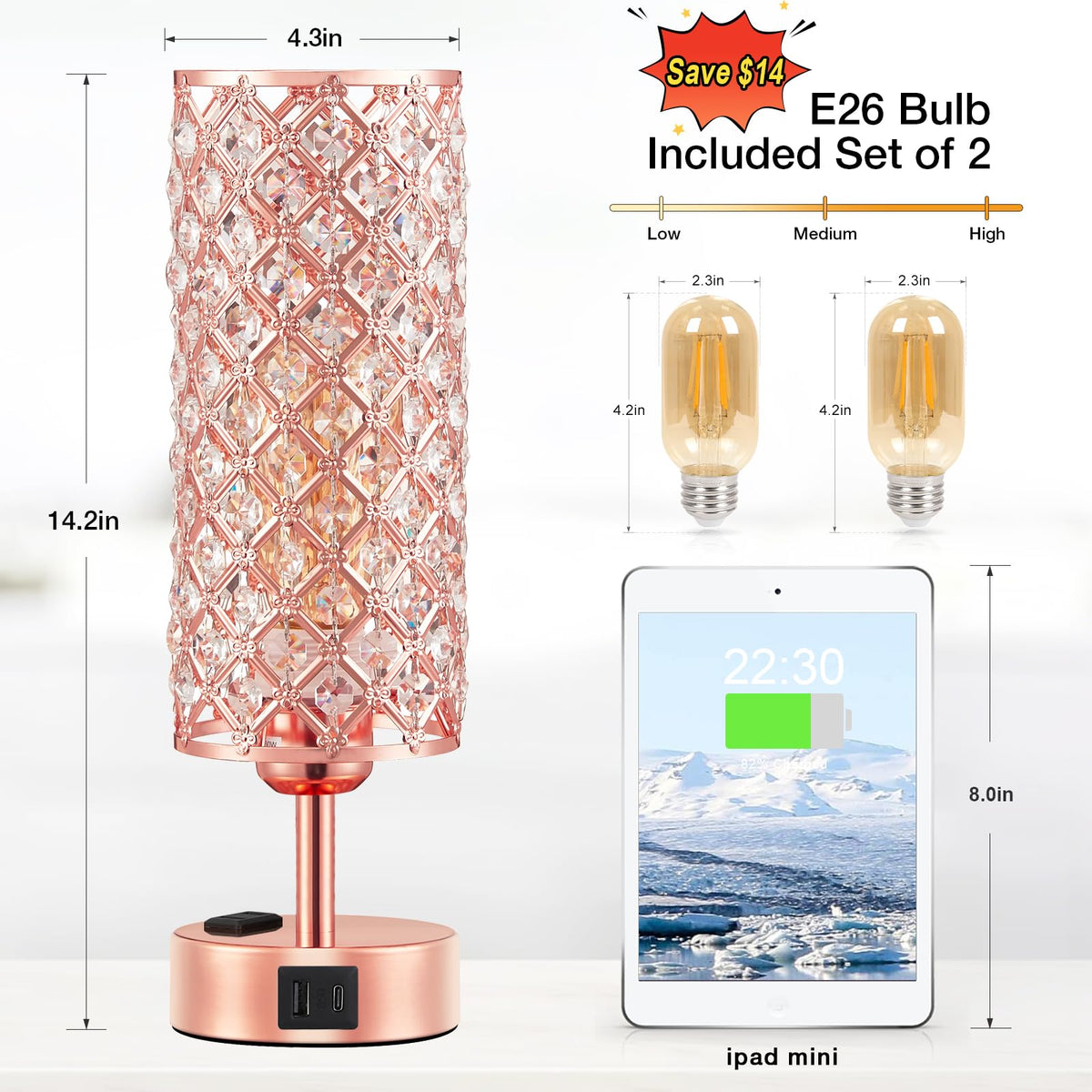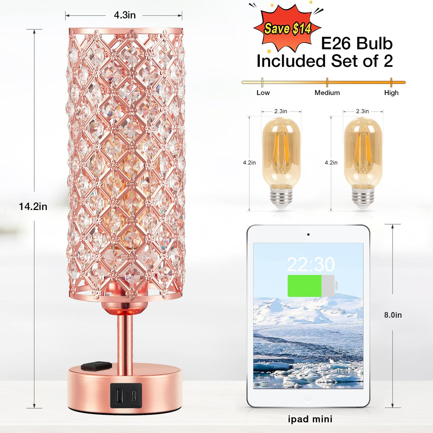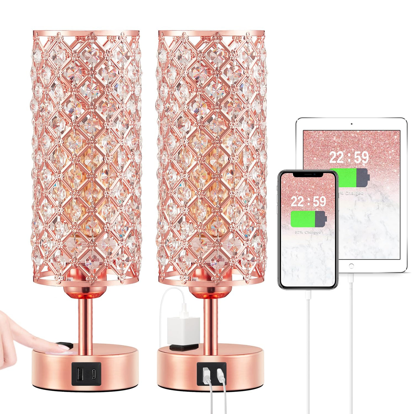 Touch Control Rose Gold Crystal Table Lamp Sets Of 2 Touch Feature To Turn On And Off The Lights, It Makes Desk Lamp Easy To Use. Crystal Design Makes Table Lamp Set Of 2 Look Sparkling, Adding A Romantic Atmosphere To Your Room Different Novel Ideas Come Together In A Very Stylish Design To Form This Fantastic Product! Very Handy Design Bedside Touch Lamp With Lightweight But Modern Elegant Design, Crystal Table Lamp Doesn'T Take Up Much Space, But Provides Great Lighting And Has Usb-C+A & Ac Ports For Convenient Device Charging. ?Specifications? ?Voltage: 120V ?Base Type: E26 (Bulb Included) ?Max Power: 60W ?Bulb Included: Yes ?Switch: Touch Control ?Body Material: Metal Base /Crystal Lamp Shade ?Dimension: 14.2H) X 4.3D) X 4.3W) ?Power Source: Corded-Electric ?Item Weight:1.7 Ibs ?Color: Rose Gold Ideal Gifts For Christmas, Birthday, Anniversary Rose Gold Crystal Table Lamp Will Be A Nice Home Decorations Or Gift For Thanksgiving, New Year, Weddings, Parties Or Other Special Events. It Will Fit And Elevate The Aesthetics Of Any Environment. The Crystal Bedside Lamp Displays A Luxurious And Beautiful Warmth Atmosphere To A Room. Rose Gold Lamp Set Of 2 Bring A Bright And Shiny Touch To Your Beautiful House, Making Your House Much More Welcoming And Fancy! The Usb-C+A Charging Ports+Ac Ports Design Giving This Beautiful Rose Gold Table Lamp With Both Artistic Value And Practical Value.This Convenient Design Will Surprise And Delight People Who Receive This Gift.