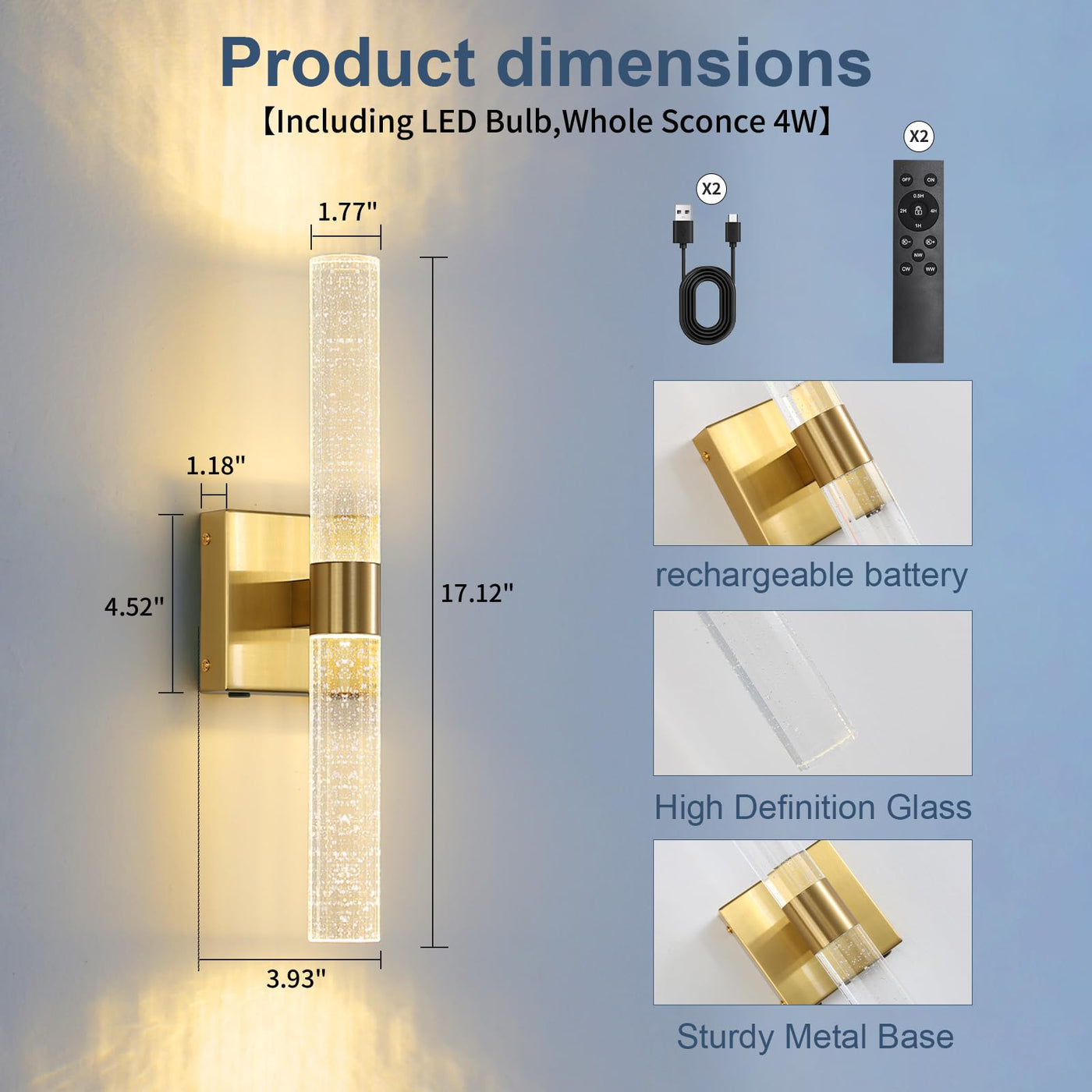 HONGREN Wall Sconces Set of Two - 17 Inch Gold LED Dimmable Battery Operated Light with Remote Control