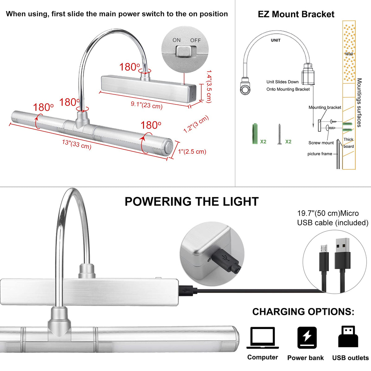 - **Adjustable Lighting Direction**: The arm and light tube can be rotated 180°, allowing you to customize the lighting direction for optimal illumination of your artwork, photos, or displays.