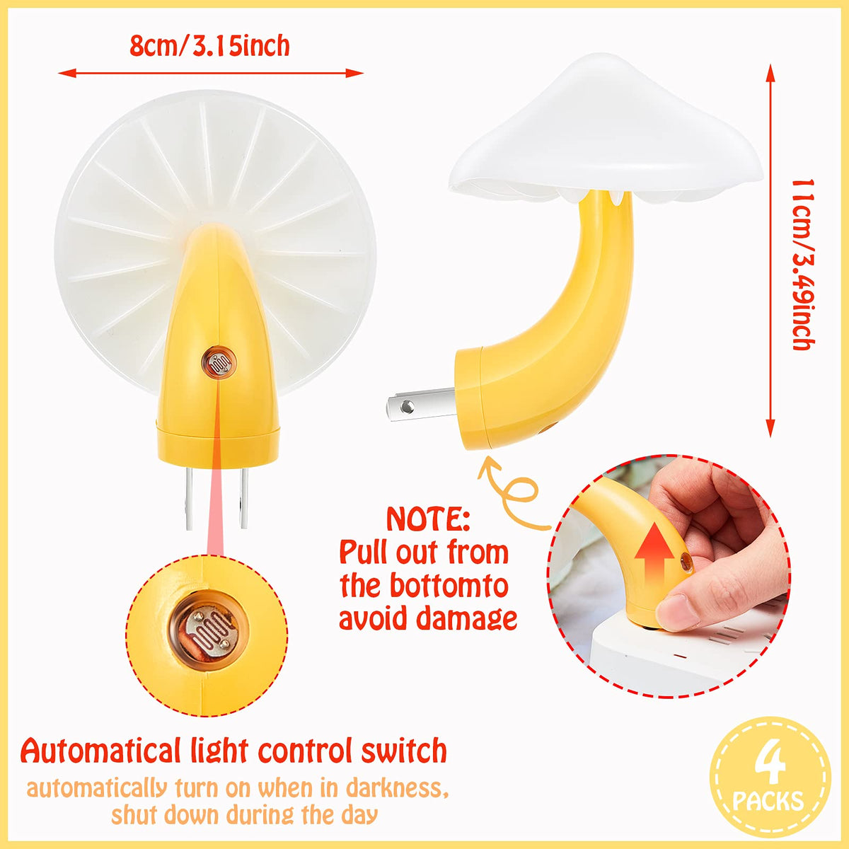 Specifications: - **Plug Type**: US plug - **Material**: ABS, LED - **Weight**: 46g - **Dimensions**: 8.3 x 4.2 x 10.5 cm / 3.27 x 1.65 x 4.13 inches - **Light Source**: LED - **Wattage**: 0.6 watts - **Color**: Yellow light with white cover