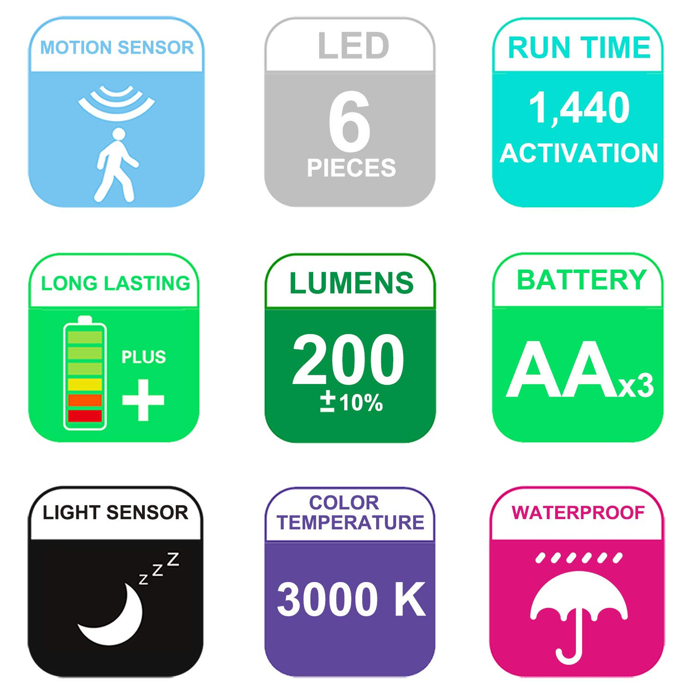 Q: What type of batteries does this motion sensor light require?A: This motion sensor light is powered by 3 AA batteries, which are not included in the package. Each set of batteries offers a runtime of approximately 80 hours.