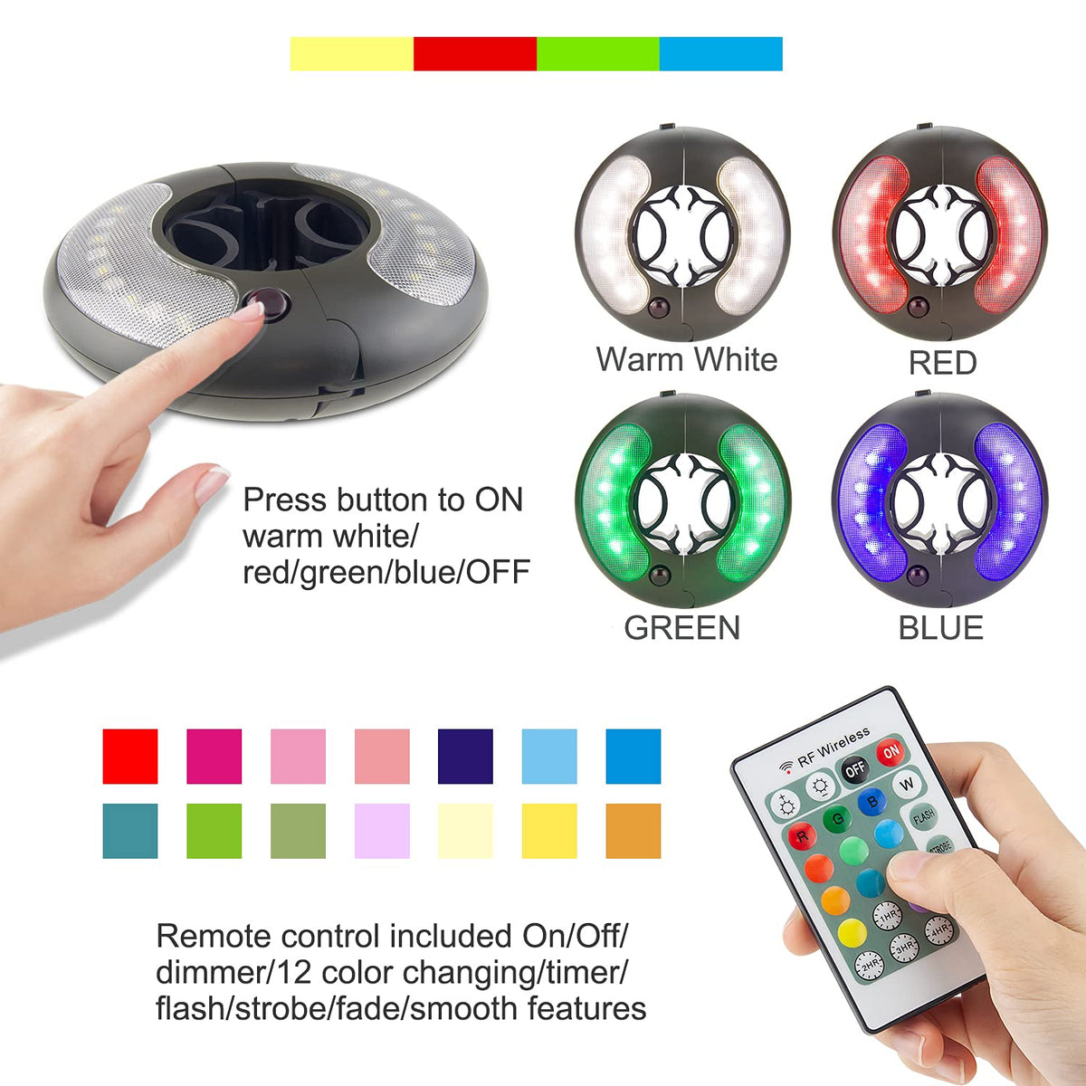 More Details*RF Signal remote control can work through glass&walls without interfering the other electronic devices.* 18 super bright LED lighting, 120 Lumens, 4000K warm white light , 1.26W, DC 4.5V, lifespan is 30,000 Hours.* Powered by 3 AA batteries (not included) and the batteries run time is 38 hours.* The RF remote control will operate outdoor patio lights within 80 ft. One radio frequency remote control can control multiple lights within the remote distance coverage.InstallationPole mounted:(1)Press the Quick Release Button to separate the light. (2)Place the light around the pole and re-connect the light. Be sure it clicks closed securely. Hanging hooks mounted:Easy to hung on anywhere with hanging ring and two hanging hooks.Note: Kindly remind you that the umbrella light is not waterproof, its best to take it off if in inclement weather. Umbrella and batteries are NOT included(Require 3x AA batteries)Packing List- 1 x Patio Umbrella Light with Hanging Hooks- 1 x Remote Control- 1 x Hanging Ring- 1 x User Manual