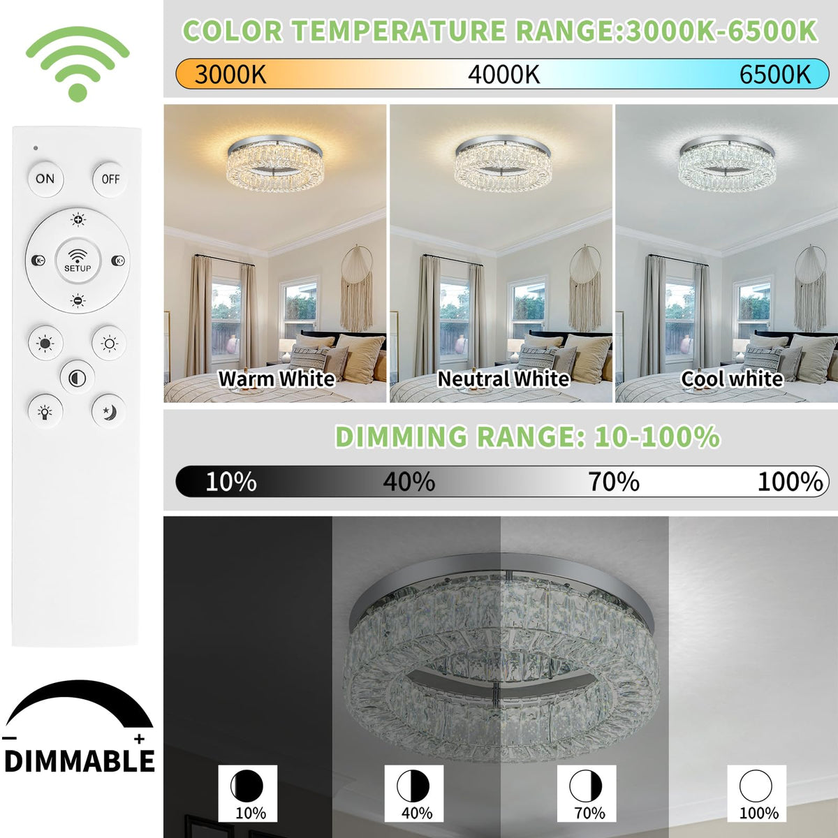 Q: What is the color temperature range of the HOPGGIE dimmable chandelier?A: The HOPGGIE dimmable chandelier allows you to adjust the color temperature from 3000K to 6500K, enabling you to create the perfect ambiance for any occasion.