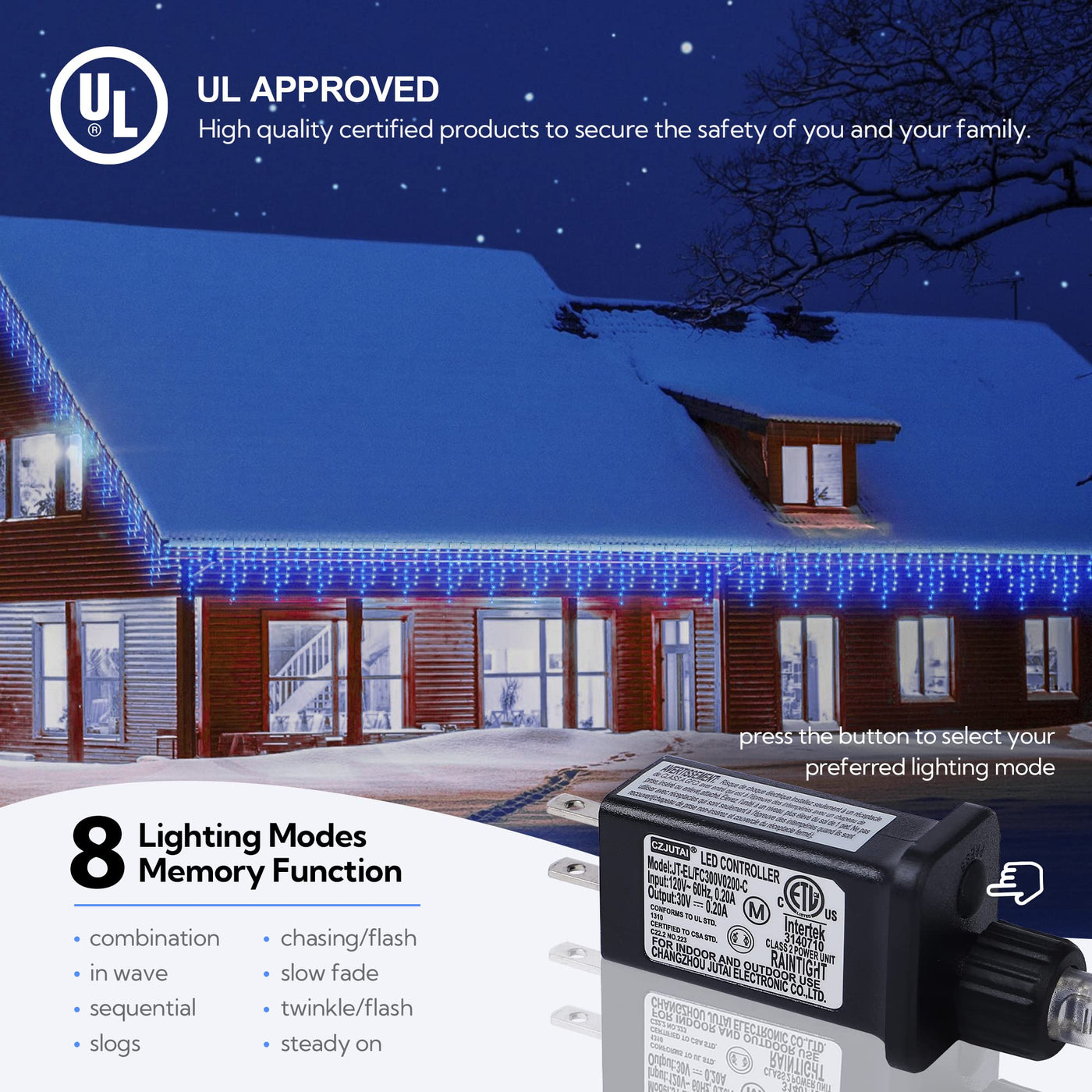 Q: How many lighting modes do these icicle lights have?A: The icicle lights feature 8 different lighting modes, including combination, in waves, sequential, slogs, chasing/flash, slow fade, twinkle/flash, and steady on, allowing you to create the perfect ambiance for any occasion.