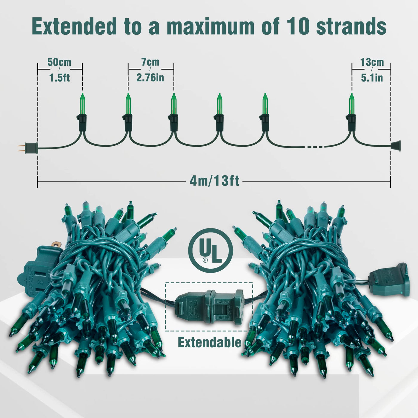 ? 100 Incandescent Christmas Lights: Each pack contains two strings of 50-count mini lights with an elegant green wire.
