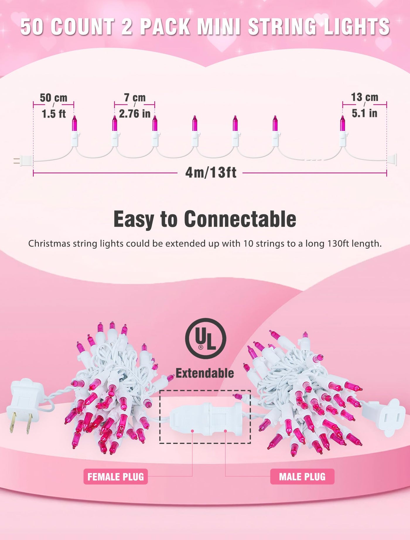 Hopolon Pink Mini Christmas Lights,2 Pack 13Ft 50Count Fairy String Light Set,White Wire Incandescent Pink Valentines Day Lights Connectable For Indoor Outdoor Wedding Birthday Valentine’S Day Decor