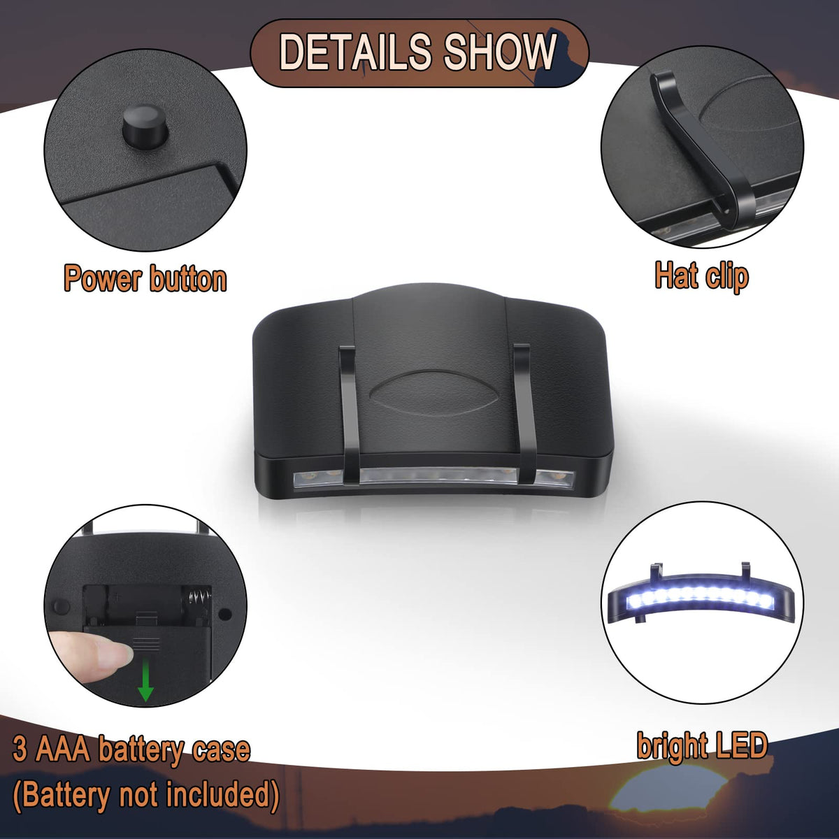 Features:Practical gift:You can send this head lamp hat to your friend, colleagues, workmates, neighbors, family members for daily use, which can bring much convenience to their life.Waterproof design:The LED headlamp is waterproof, so you don't need to worry about the raining or snow weather when you are outdoors. In addition, this rotatable cap light can protect against water from splashing or rains to make your outdoor activities more enjoyable and convenient.Specifications:Main material: plastic Main color: blackSize: approx. 3.4 x 2.2 x 0.5 inches / 8.7 x 5.6 x 1.2 cmPackage includes:10 x LED Rotatable cap hat lightsNotes:Manual measurement, please allow slight errors on size.The color may exist a slight difference due to different screen displays.