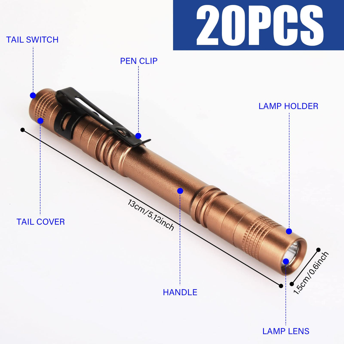 Hortsun Mini Pen Light Flashlights, 20 Pcs, 5.12 Inch, Aluminum, Brown, Pocket Size LED Torches for Fathers Day Gifts