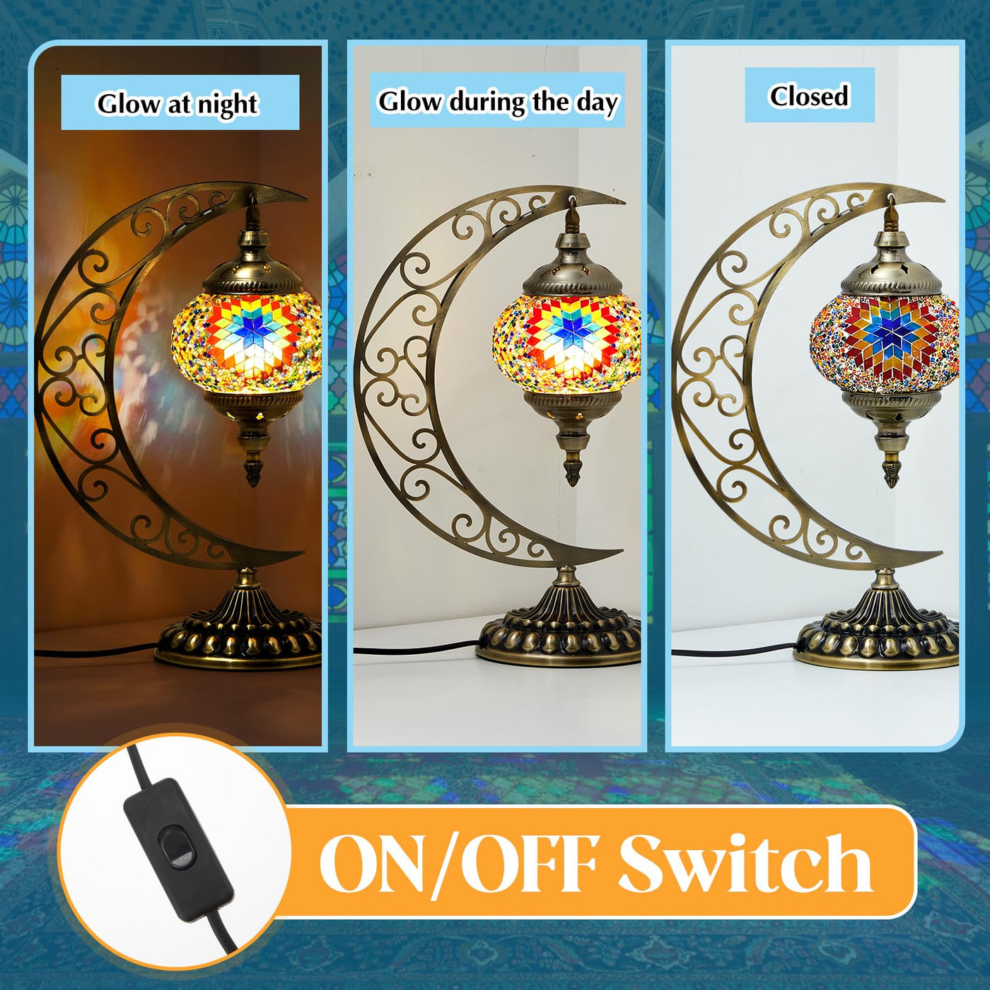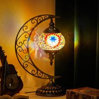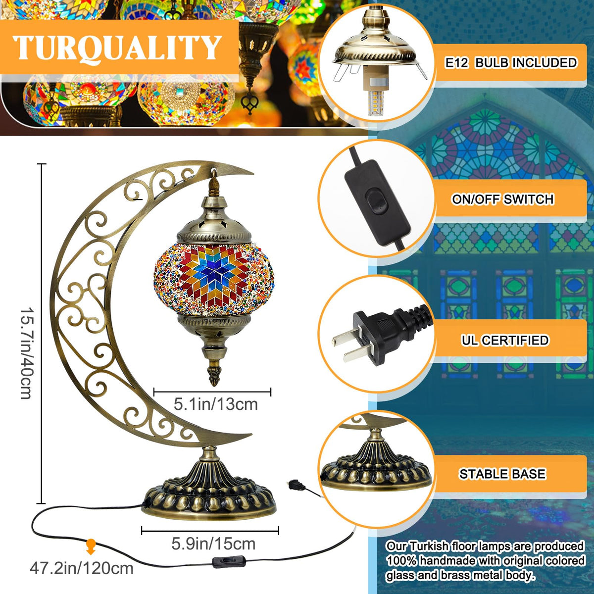 Hortsun Turkish Lamp Moon Shaped Moroccan Lamp Turkish Mosaic Stained Glass Table Light With Bronze Base Colorful Moroccan Globe