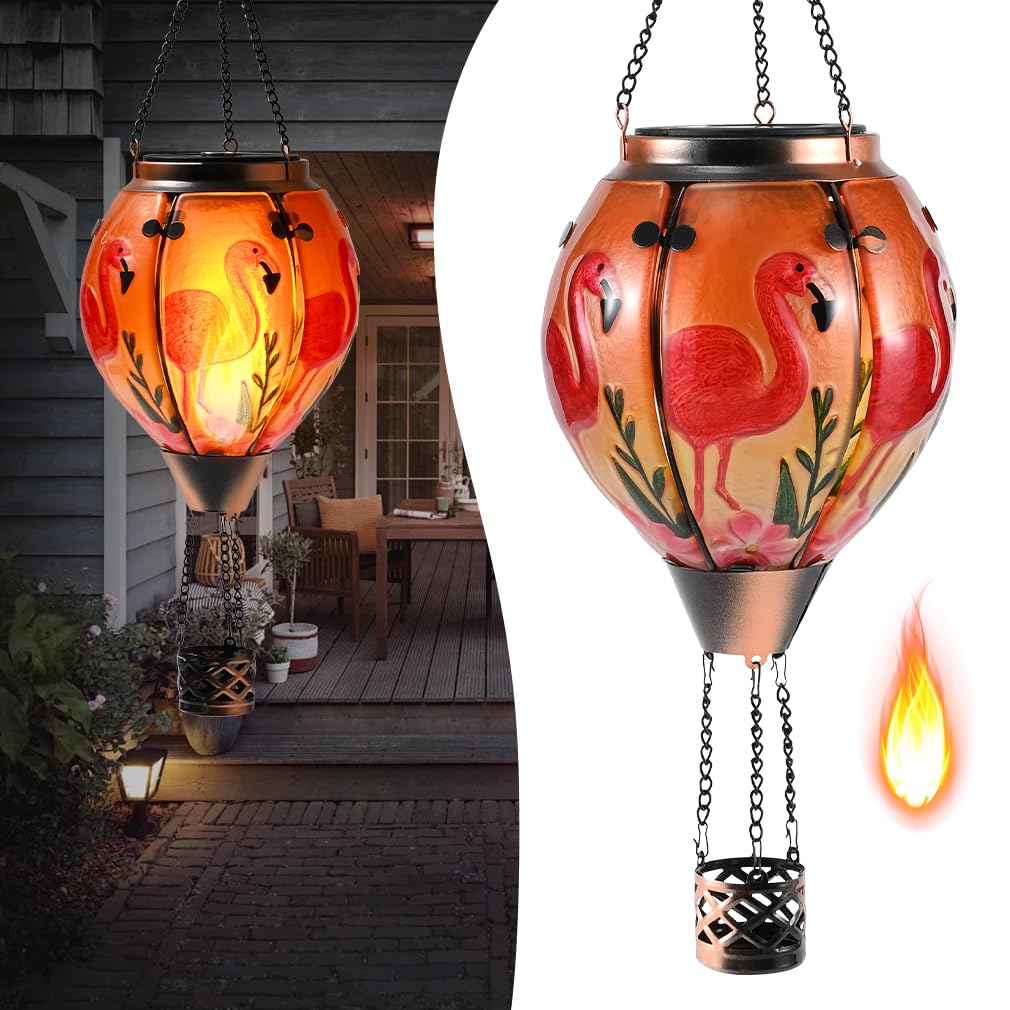 Hot Air Balloon Solar Lantern - Flamingo Stained Glass Lantern Simulated Flickering & Dancing Flame Outdoor Hanging Yard Light Waterproof Ip65 For Patio Lawn Porch Decor Gift