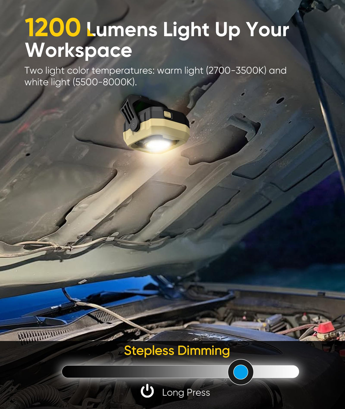 This work light features a robust aluminum body that ensures durability while maintaining a lightweight design for easy transport. It is equipped with a rechargeable 4000mAh battery, providing long-lasting power for extended use. The LED technology delivers up to 1200 lumens of brightness, making it ideal for illuminating dark spaces effectively. Its stepless dimming capability allows for precise control over light intensity, adapting to different needs and environments.