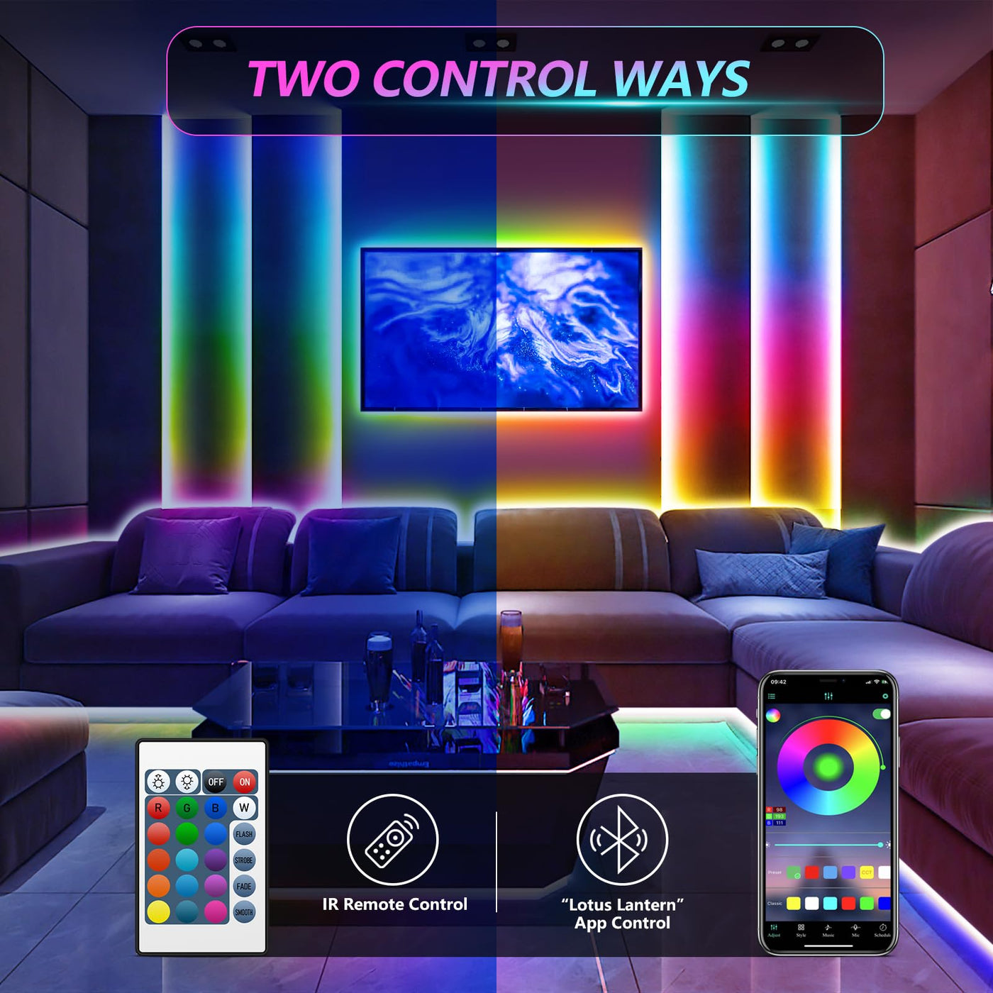 Q: How can I control the LED strip lights?A: You can control the HOUHUI LED Strip Lights in two ways: through a smartphone app, where you can adjust brightness, colors, and modes, or via a 24 Key remote controller for quick access to settings.