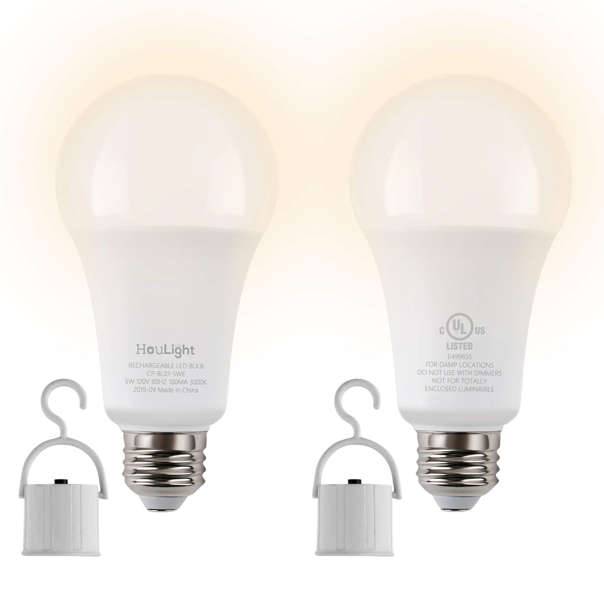 Houlight 5W Emergency Led Light Bulbs, Rechargeable, 3000K Warm White, 2-Pack For Power Outages