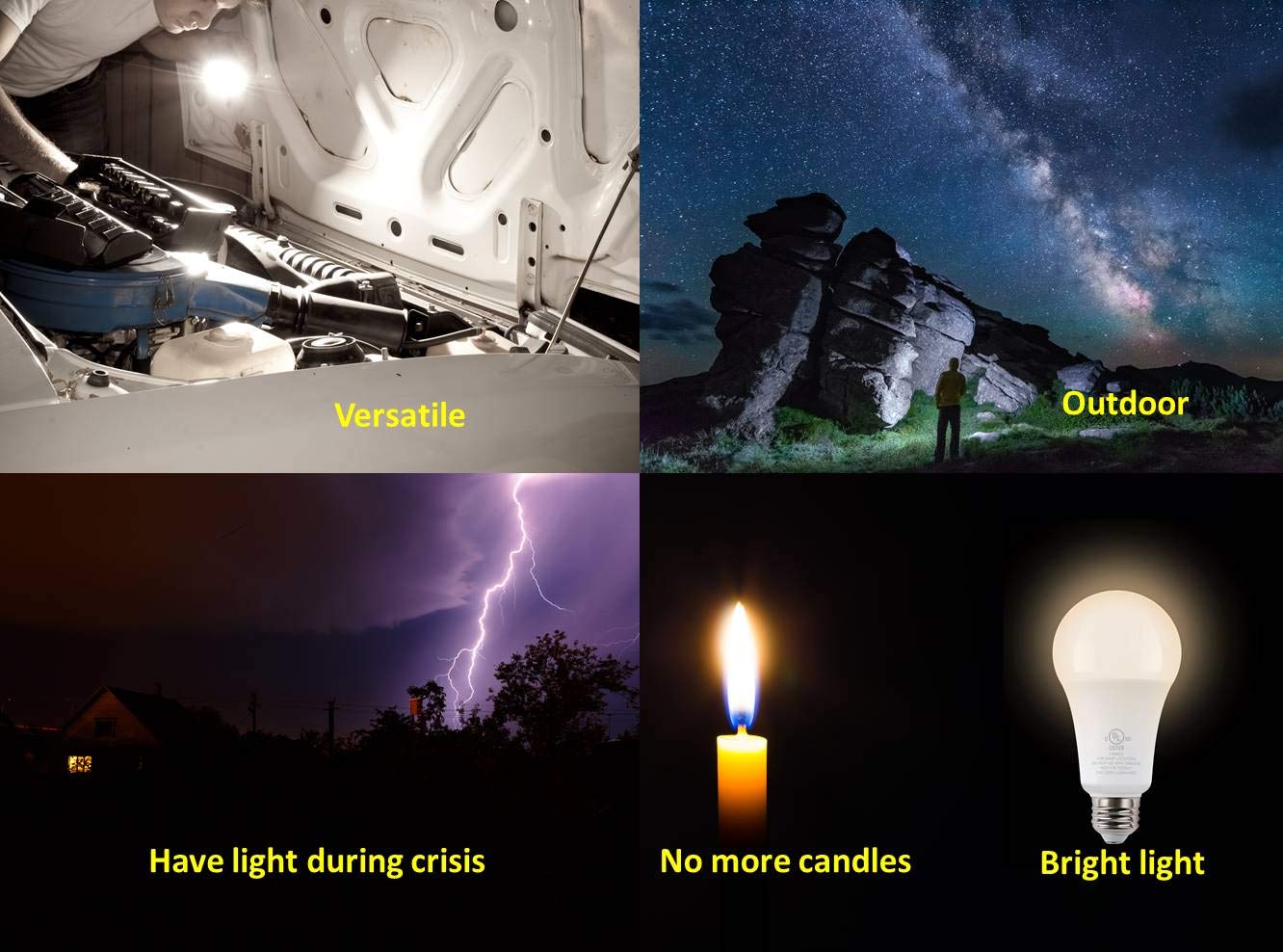 - **Versatile Usage**: Ideal for a wide range of applications, including households, garages, camping sites, and emergency preparedness kits. Use them as standard bulbs in lamps or take advantage of their portable design for outdoor adventures and emergency situations.