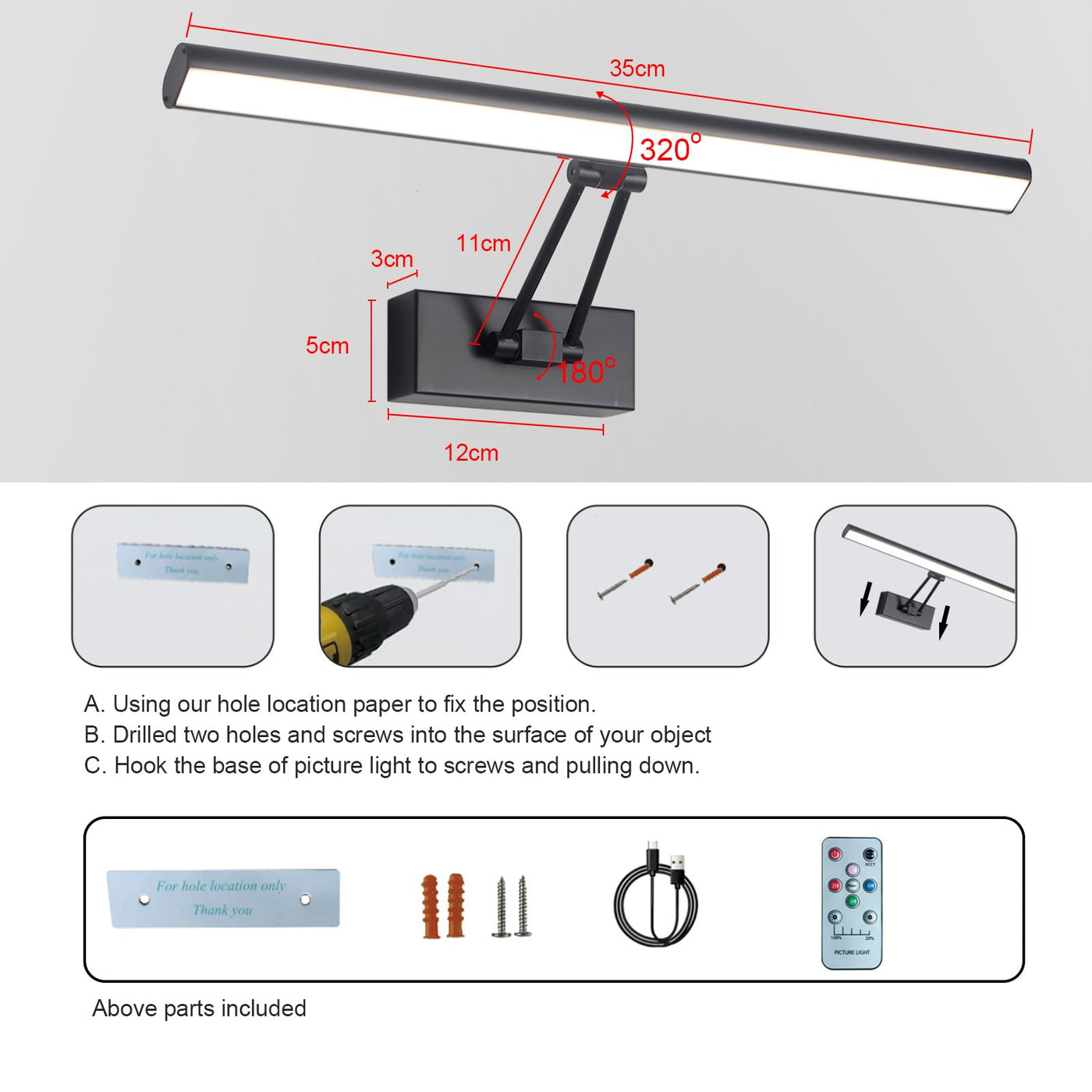 PACKING LIST - 1 x Wireless Picture Light - 1 x USB Type C cable - 2 x Screw - 1 x Remote Control - 1xUser Manual - Hole Location Paper