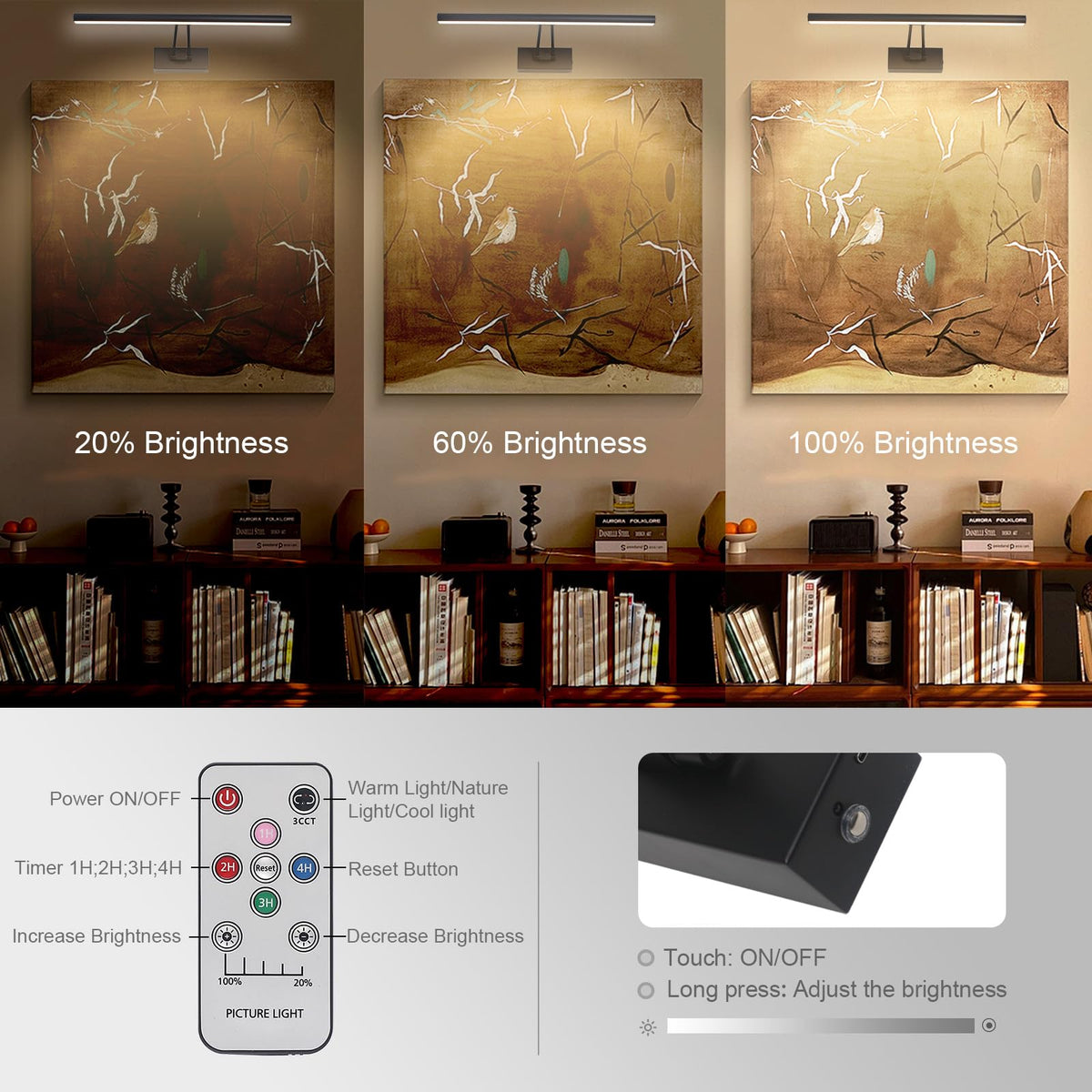Q: Can I control the brightness and color temperature of the picture light?A: Yes, the HOWMZON Picture Light comes with a remote control that allows you to adjust the brightness from 20% to 100% and change between three color temperatures: warm light, natural light, and cool light.