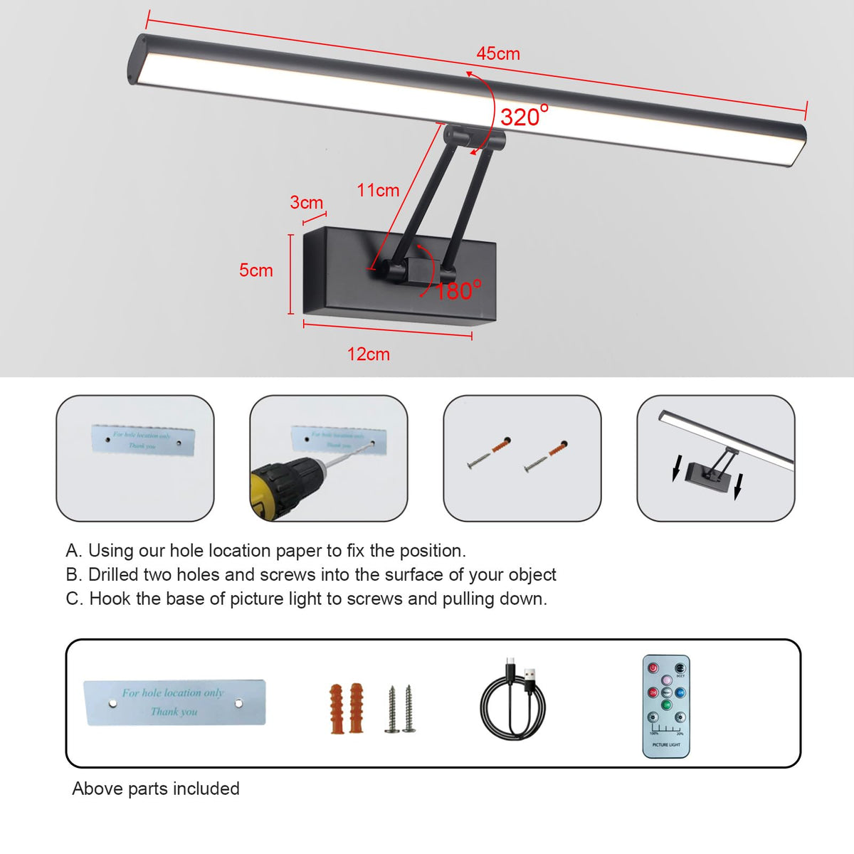 PACKING LIST - 1 x Wireless Picture Light - 1 x USB Type C cable - 2 x Screw - 1 x Remote Control - 1xUser Manual - Hole Location Paper