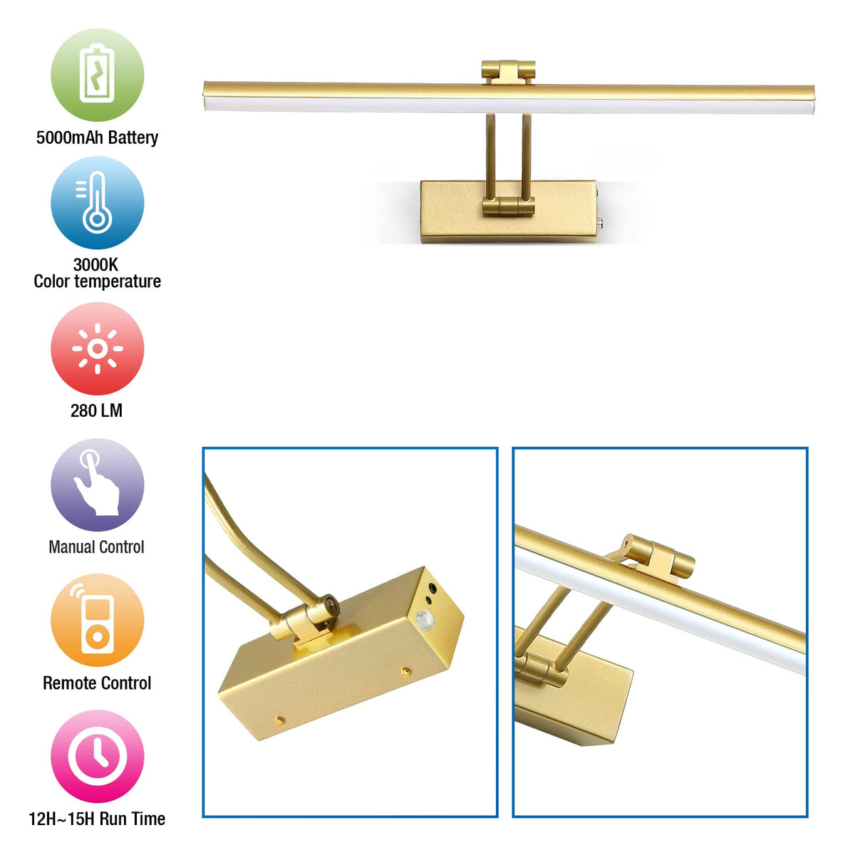Constructed from durable metal, the picture light features a sleek and elegant gold finish, making it a perfect addition to any decor style. Its 16-inch size and adjustable head allow for versatile positioning, ensuring optimal lighting for various settings, including galleries, bedrooms, and nurseries. The light is powered by a built-in 5200mAh rechargeable battery, providing convenience and eliminating the need for complicated wiring. Installation is straightforward, requiring only two drilled holes to secure the mounting bracket, allowing you to hang the light with ease.