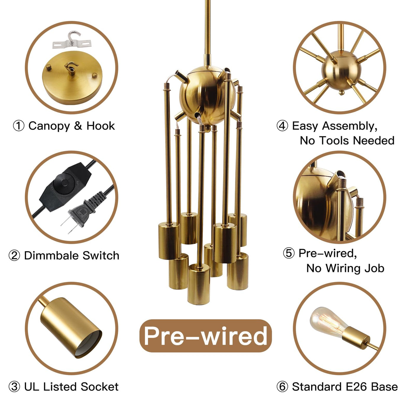 Hoxiya 26.3" Dimmable Brass 8-Light Sputnik Chandelier, Modern Plug-In Pendant Light Fixture