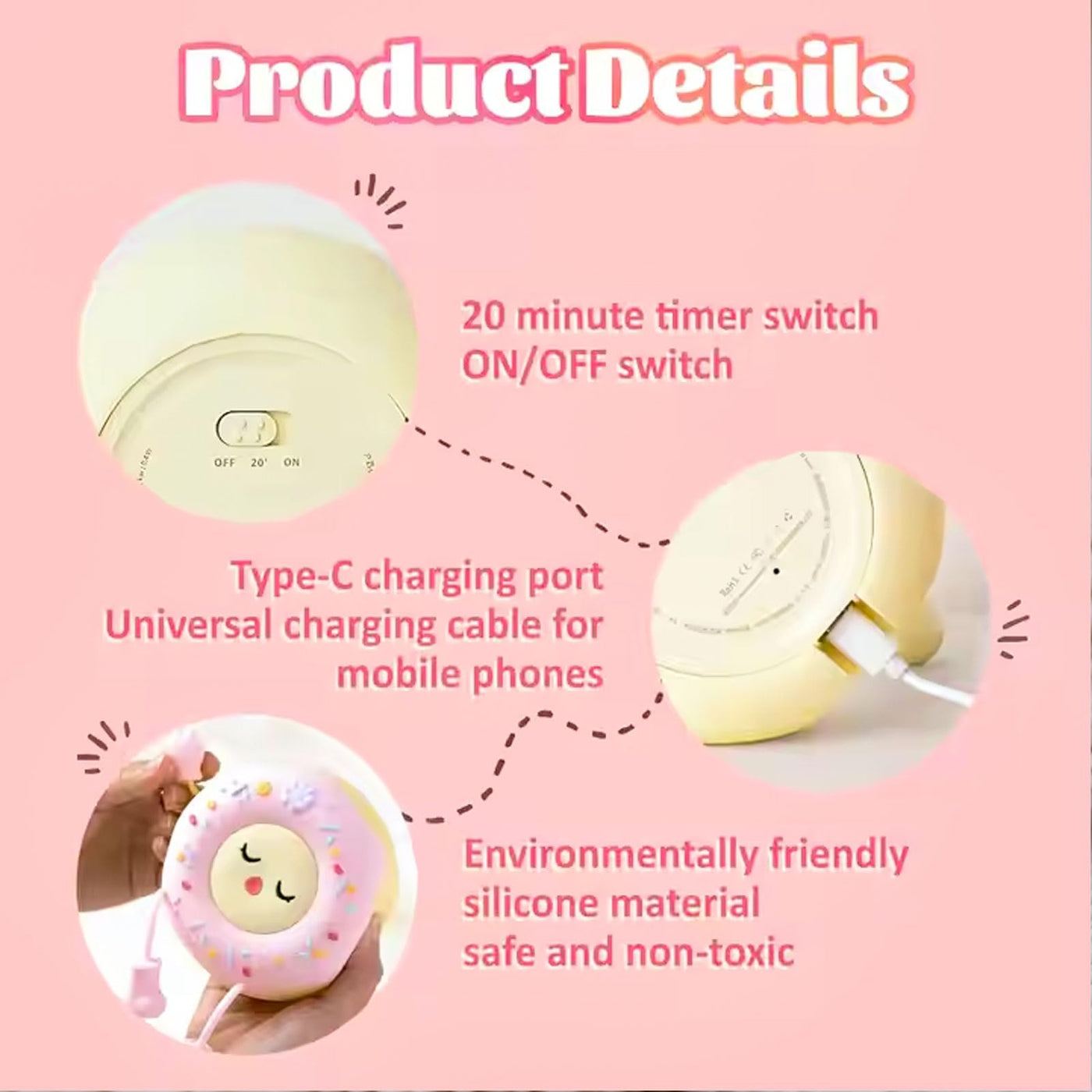 Product Parameters: &Nbsp;Donut Silicone Night Light Material: Silicone Abs Pc Product Size: 130X110X60Mm Package Size: 118X120X73Mm Weight: 175G Rated Voltage: 5V Rated Power: 0.4W Battery Capacity: 800Mah Light Color: 3200K&Nbsp;Usage Scenarios:&Nbsp;Bedside Lamp: Use This Doughnut Night Light As A Bedside Lamp For Your Child Providing A Soothing And Comforting Glow For A Good NightS Sleep.Nursery Lamp: Add A Cute And Whimsical Touch To Your Nursery Decor With This Adorable Doughnut Night Light.Dorm Room Decor: Brighten Up Your Dorm Room With This Fun And Quirky Night Light Creating A Cozy And Personalized Space.With Its Charming Design Practical Features And Multiple Usage Scenarios The Cute Doughnut Night Light Is The Perfect Gift For Baby Kids Girls Teens And Anyone Who Loves Cute And Functional Room Decor. Add A Touch Of Joy And Whimsy To Any Space With This Unique And Versatile Night Light.
