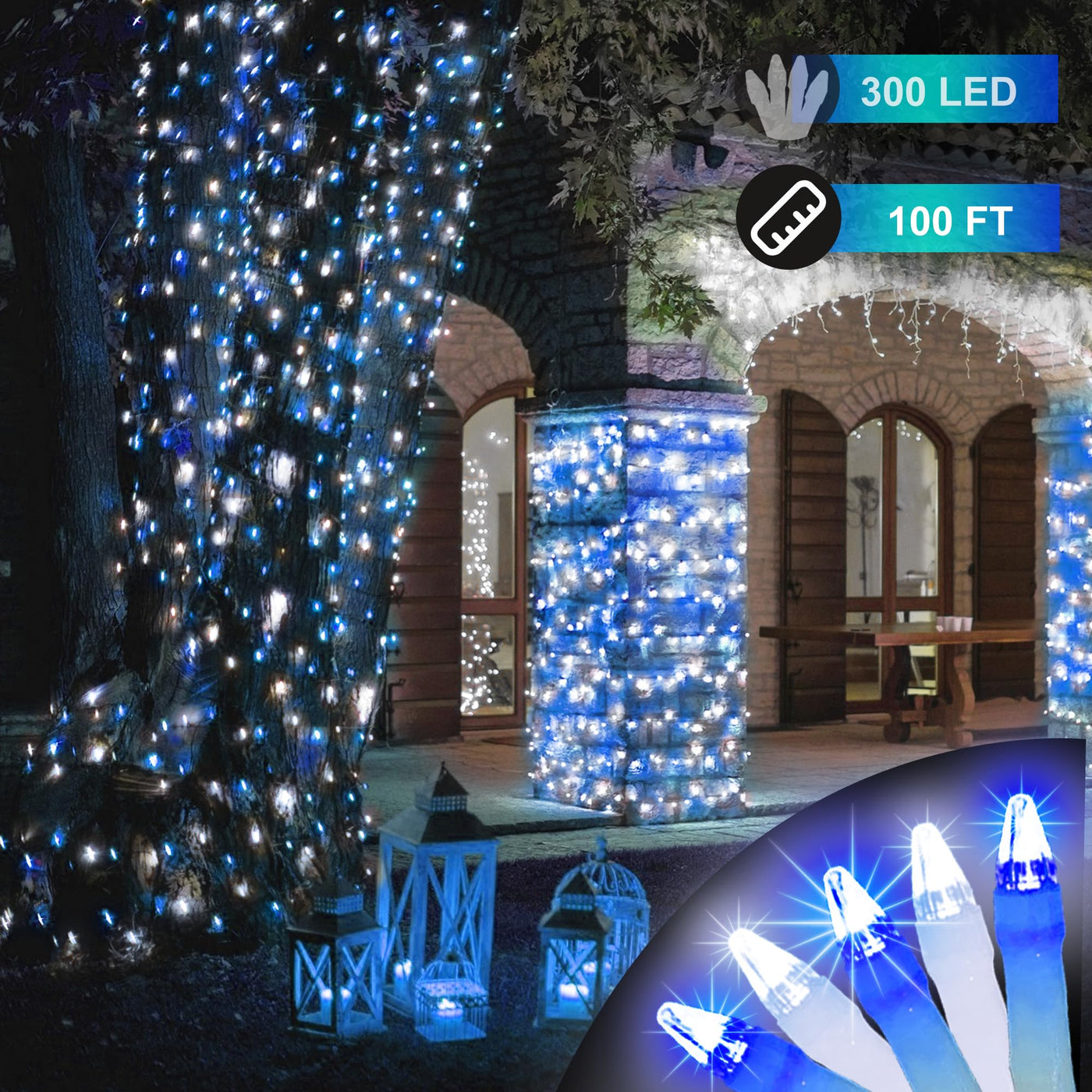 Constructed from well-made plastic, these string lights feature a captivating blue and white color scheme. The 100-foot length and 300 LED bulbs offer bright illumination, ideal for both indoor and outdoor settings. With faceted cone lenses, the lights provide enhanced brightness and color, transforming any environment into a magical space. The lights can be connected end-to-end with up to four sets for expansive coverage, making them suitable for various decorative designs.