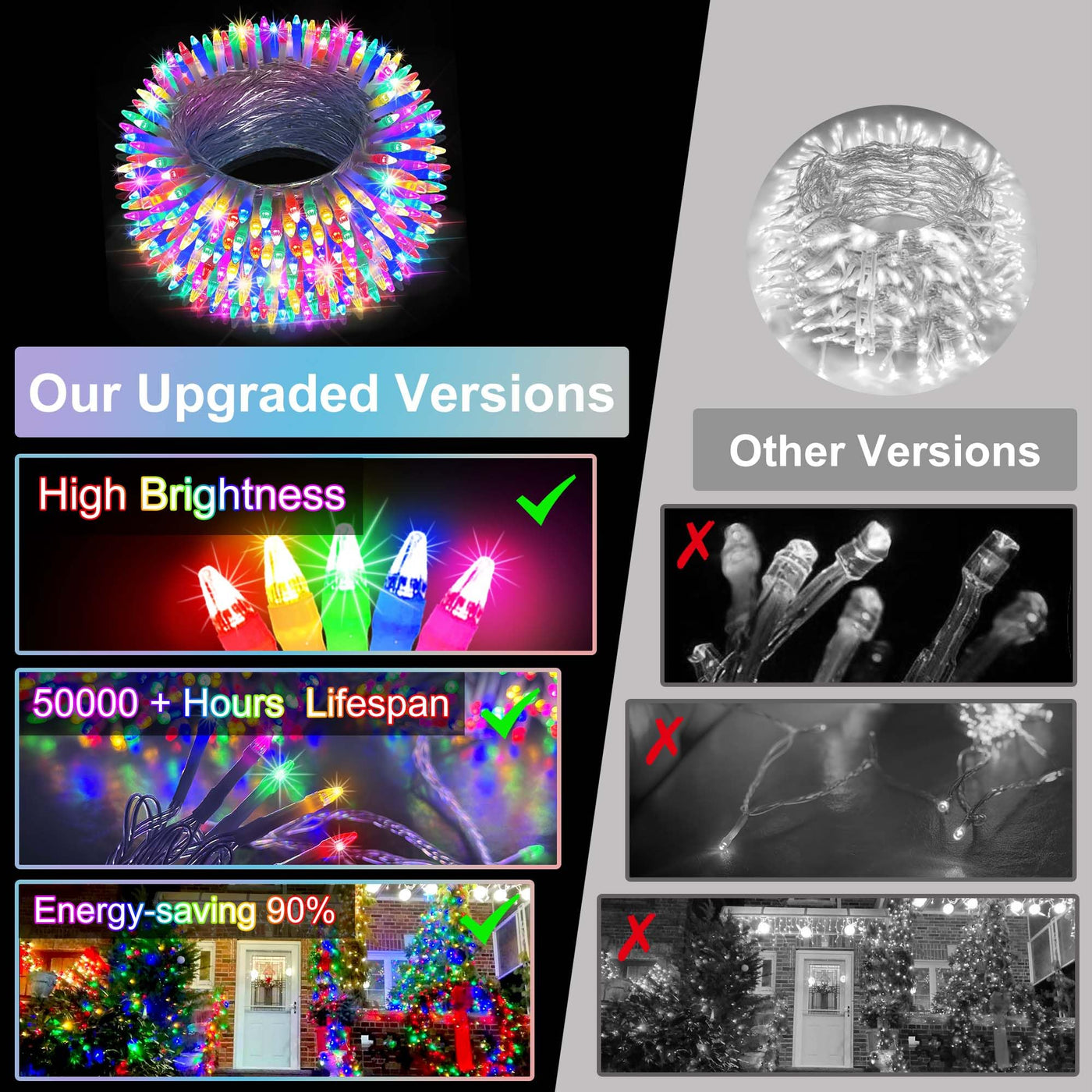 Q: What is the color of the Christmas lights?A: The LED string lights are multicolored, providing a vibrant and festive atmosphere suitable for holiday decorations.