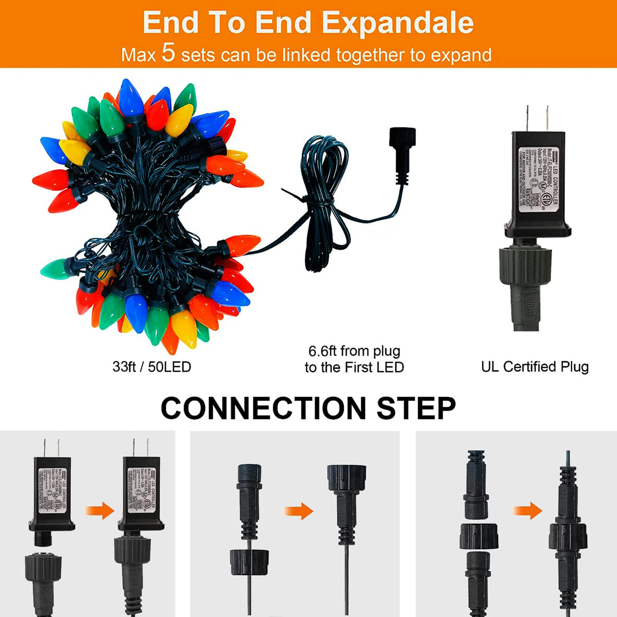 Q: How do I connect multiple sets of these Christmas lights?A: You can connect up to 5 sets of HSXLXSC C9 Bulbs Christmas Lights in series. Each string has end-to-end connectors, allowing for easy expansion and brighter illumination across a larger area.