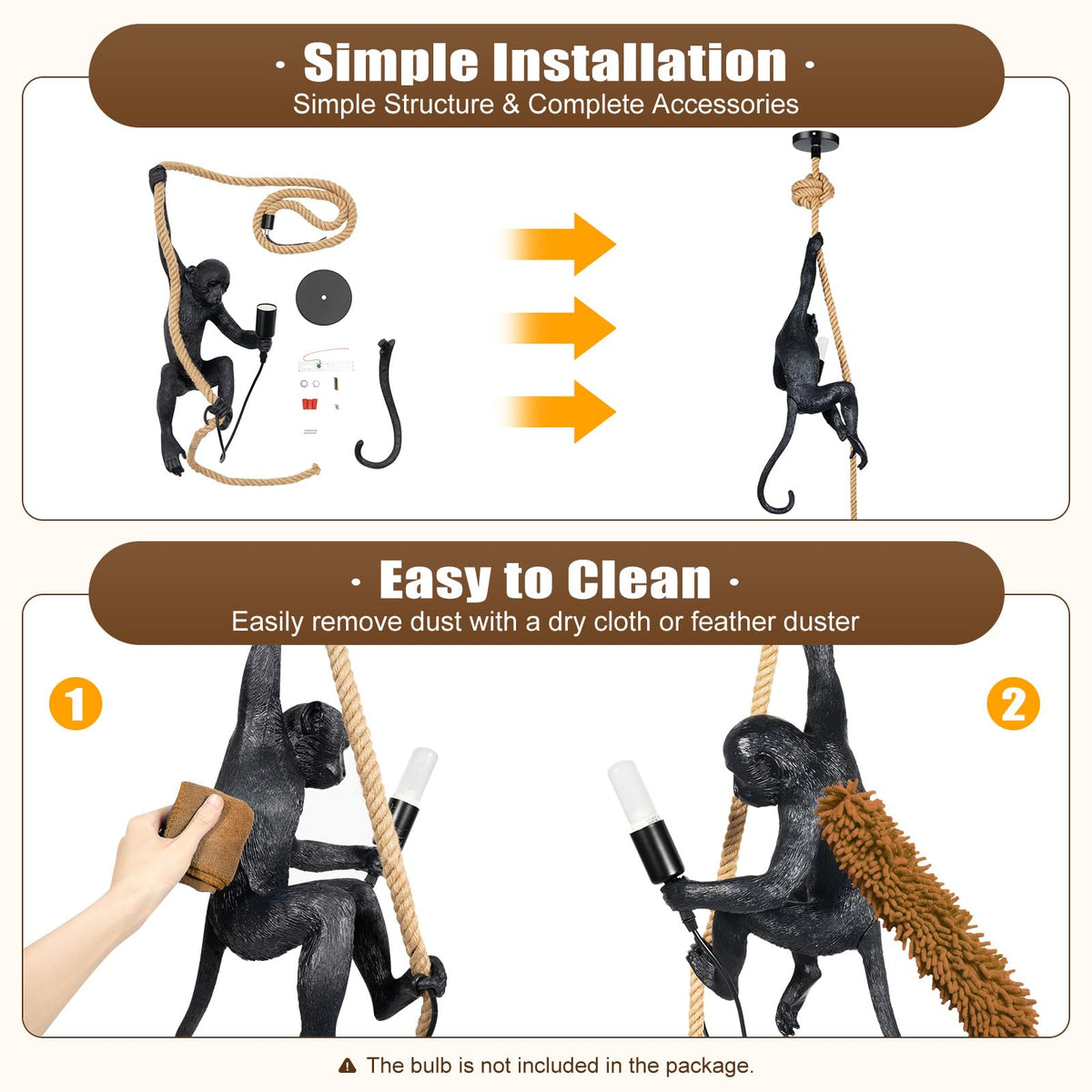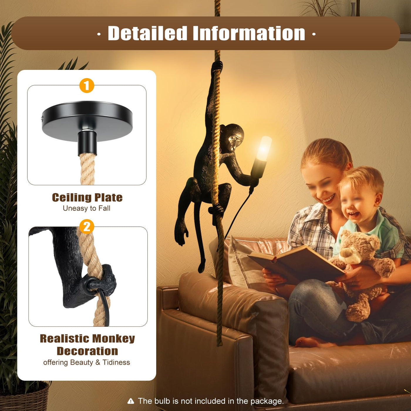 Q: Is the monkey pendant light durable and suitable for long-term use?A: Yes, the HuaShuani Monkey Pendant Light is designed for durability. It features a tough hemp rope chain, a resin monkey decoration, and an iron ceiling plate, ensuring wear-resistance, rust-resistance, and corrosion-resistance.