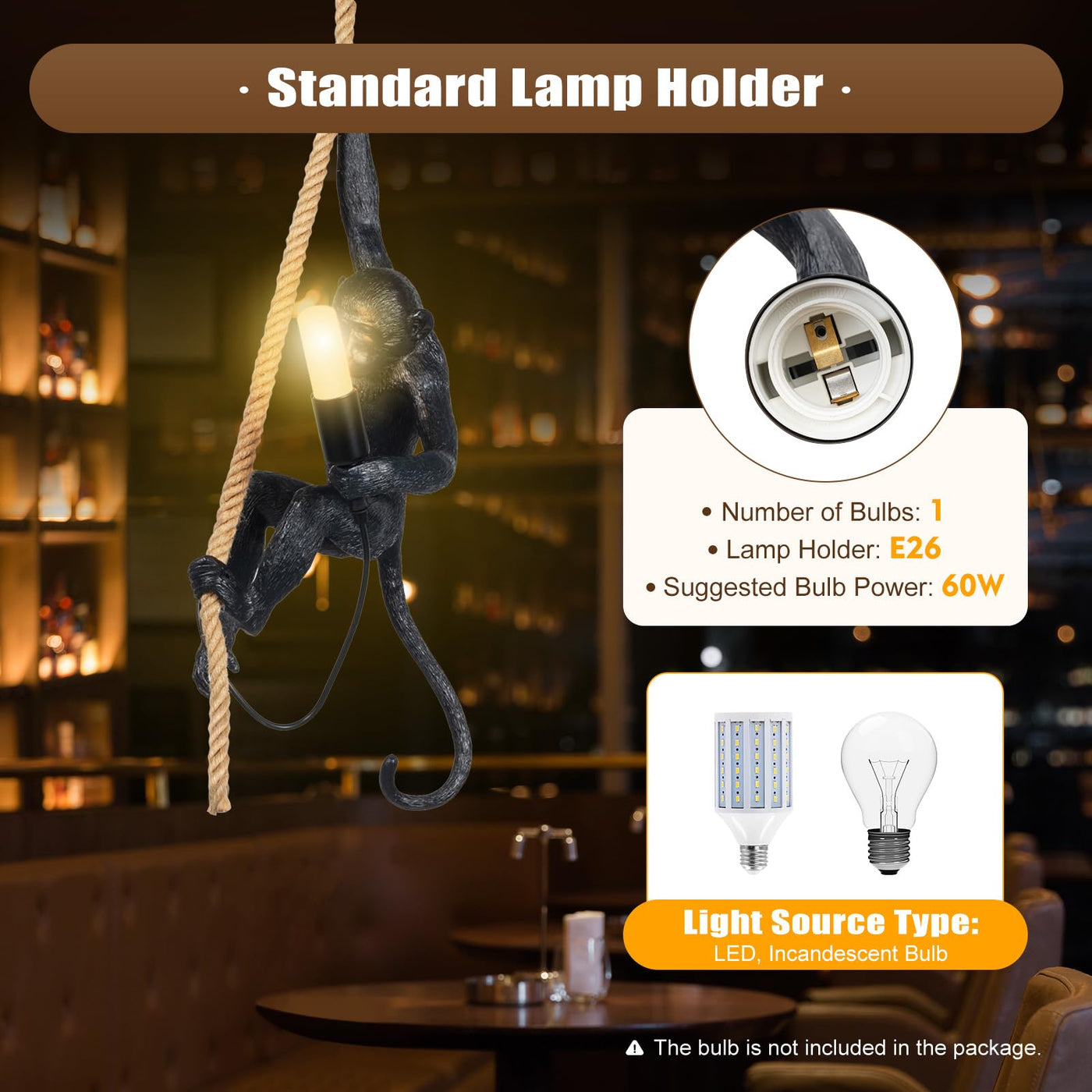 Q: What type of bulbs can be used with the HuaShuani Monkey Pendant Light?A: The HuaShuani Monkey Pendant Light features a standard E26 lamp holder, making it compatible with both LED and incandescent bulbs. Please note that bulbs are not included with the fixture.