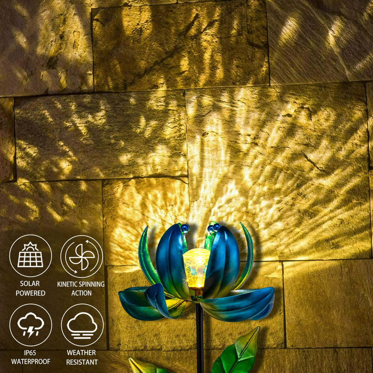 Huaxu Solar Outdoor Lights 35.4In Garden Decor Flower Wind Spinners,Waterproof Led Crackle Glass Globe Blue Lotus Art Metal Stak