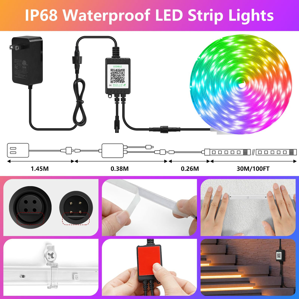 Q: Is the LED strip waterproof?A: Yes, the LED strip lights have an IP68 waterproof rating, indicating they are suitable for outdoor use and can resist moisture and rain.