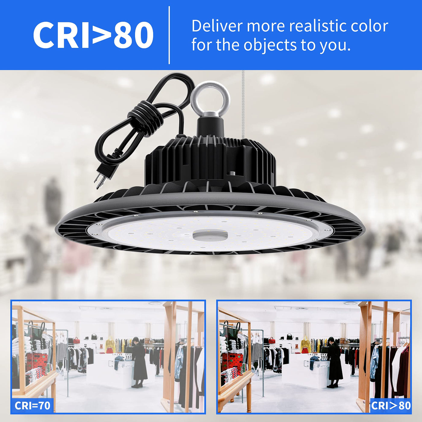 Q: What color temperature does this light emit?A: The UFO LED High Bay Light emits a color temperature of 5000K, which closely resembles natural daylight and is gentle on the eyes, making it more comfortable compared to cooler 6000K lights.
