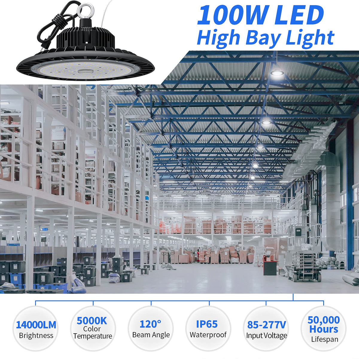 Hugtek 100W Ufo Led High Bay Light, 14000 Lm, 5000K, Ip65 Waterproof, For Warehouse
